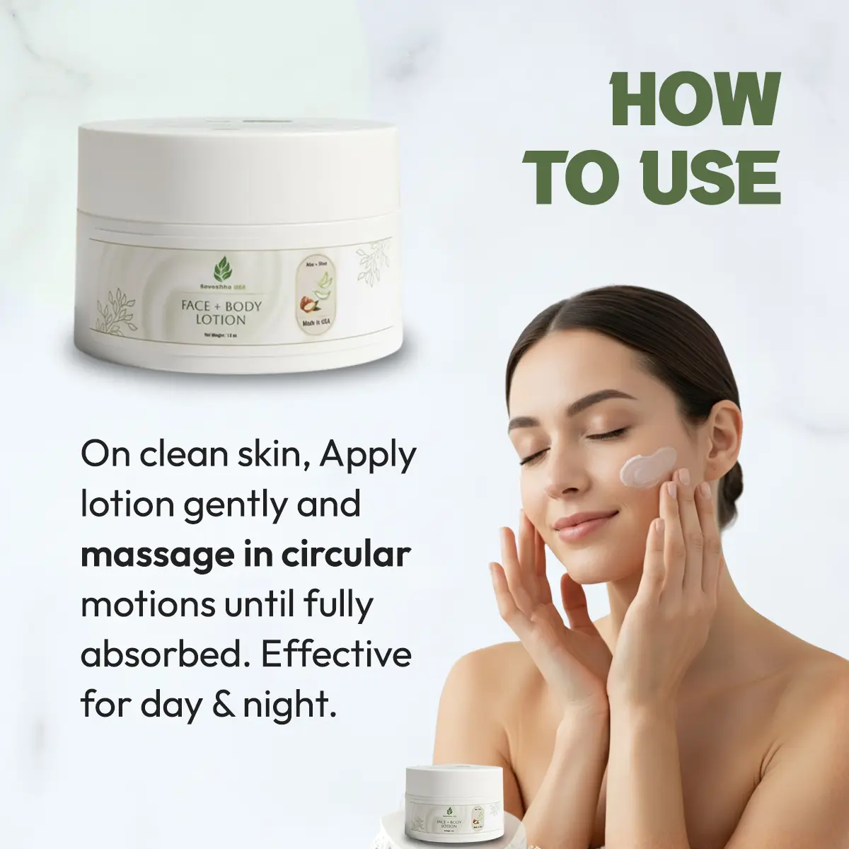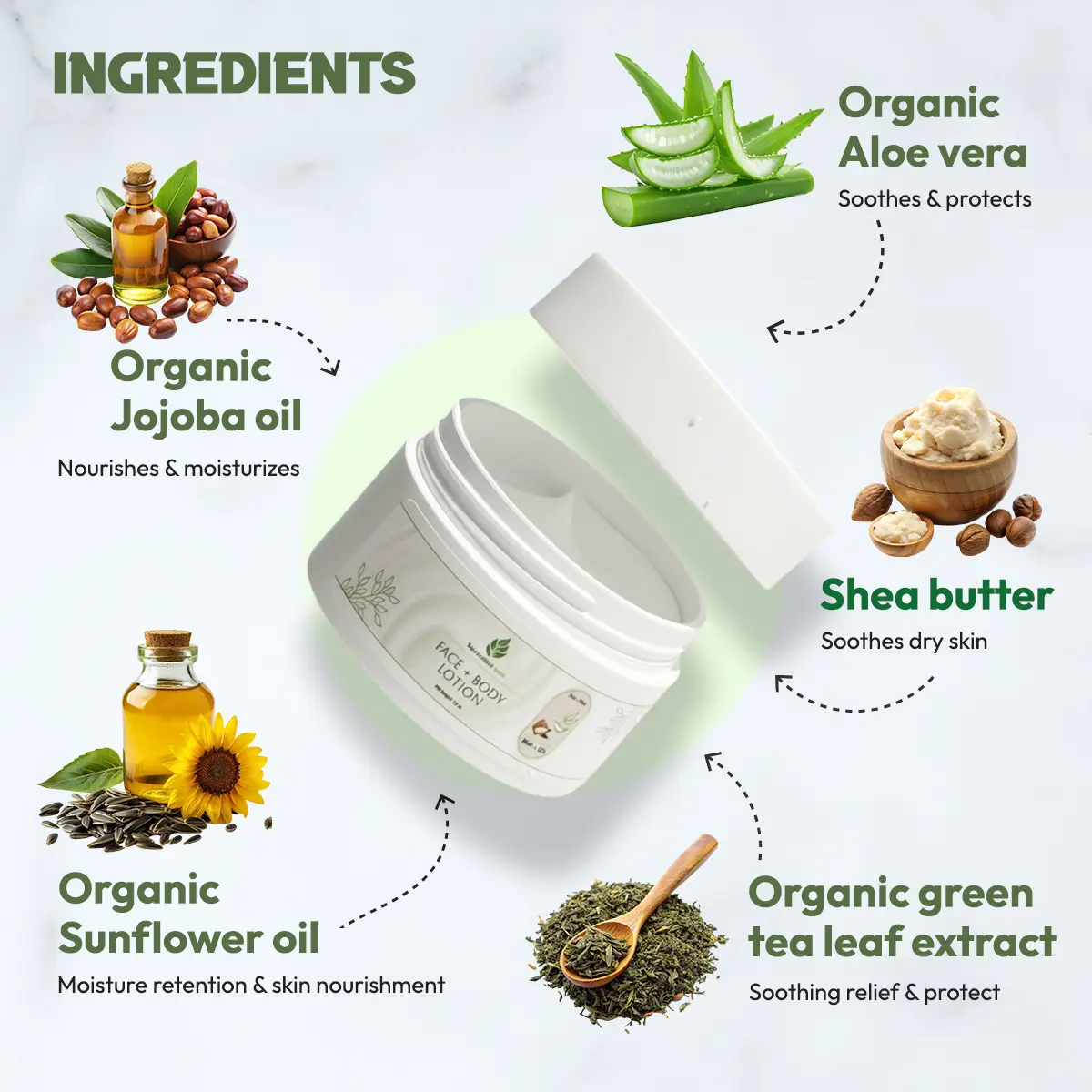 Experience clean, nourishing skincare with this lightweight daily moisturizer crafted from high-quality, naturally derived, organic ingredients. Formulated with organic aloe vera, shea butter, sunflower seed oil, and jojoba oil, this formula delivers deep hydration while remaining gentle on even the most sensitive skin. The smooth, fast-absorbing texture leaves skin soft, supple, and refreshed—never greasy. Enriched with Vitamin E, Vitamin B5, and green tea extract, this moisturizer helps strengthen the skin’s natural barrier while providing antioxidant protection against environmental stressors. The result is healthier-looking, balanced skin you can feel good about every day. Designed with a commitment to clean beauty, this formula avoids unnecessary harsh chemicals and focuses on safe, effective, plant-powered ingredients. We prioritize sustainability with responsibly sourced raw materials and ethical manufacturing practices. Proudly Made in the USA using globally sourced ingredients. Ingredients: Aloe barbadensis (Aloe vera) leaf juice*, Aqua (deionized water), Helianthus Annuus (Sunflower) seed oil*, Isopropyl palmitate, Glyceryl stearate, Cetyl alcohol, Stearic acid, Glycerin (Kosher, Vegetable), Phenoxyethanol, Butyrospermum Parkii butter (Shea butter), Simmondsia Chinensis (Jojoba) seed oil*, Tocopheryl Acetate (Vitamin E), Xanthan gum, Panthenol (Vitamin B5), Camellia Sinensis (Green tea) leaf extract*, Ethylhexylglycerin. *Organic ingredients