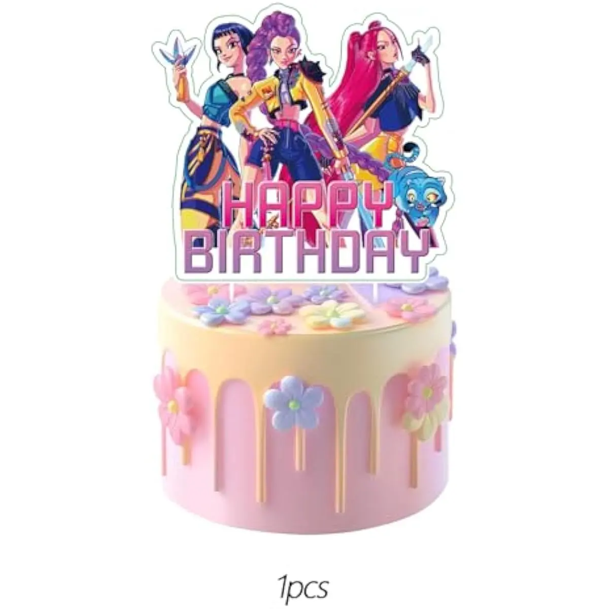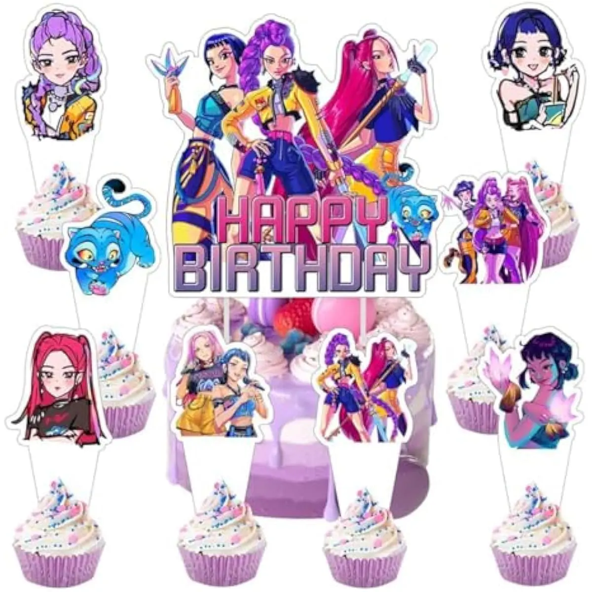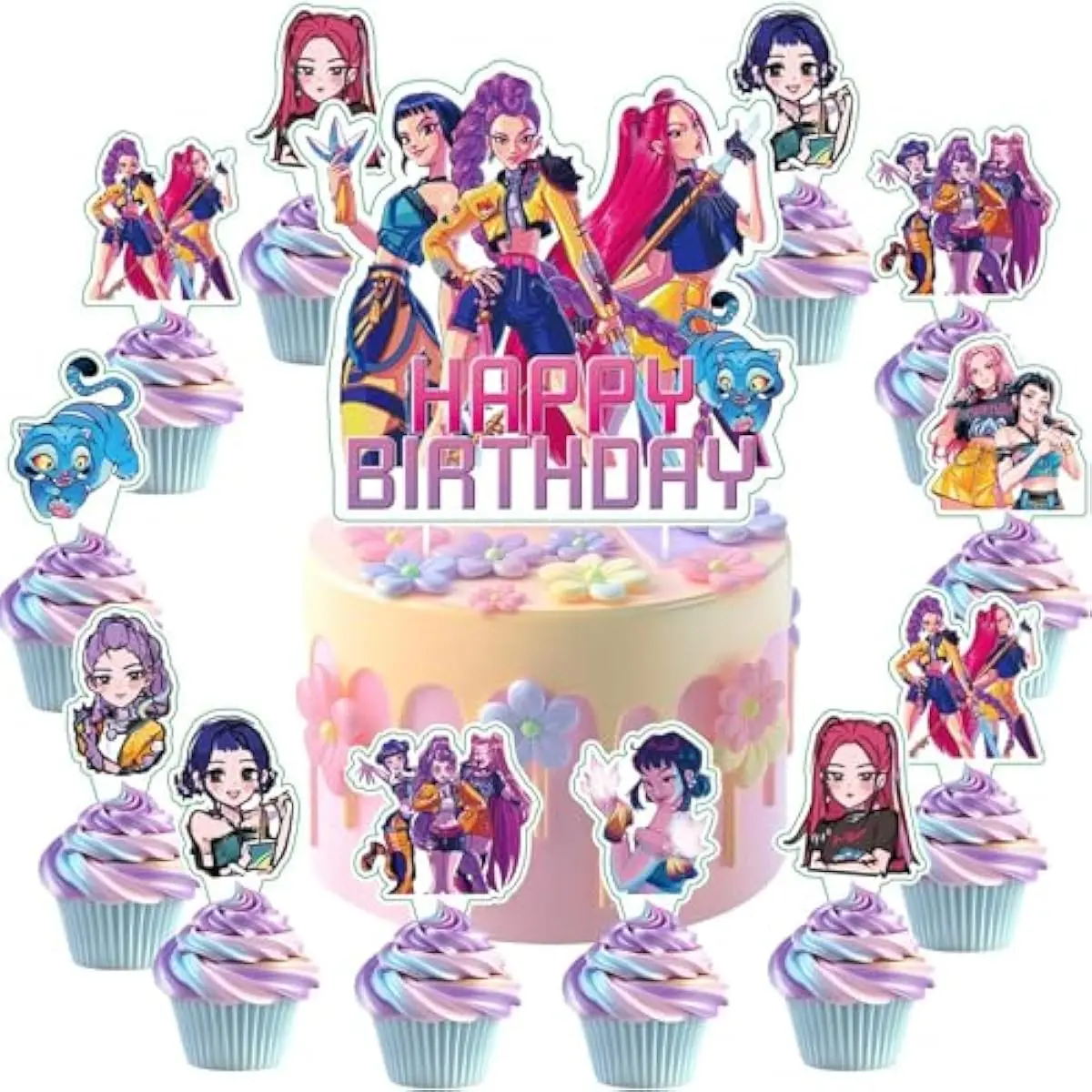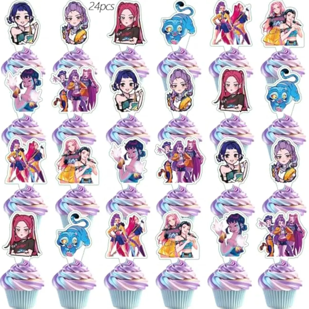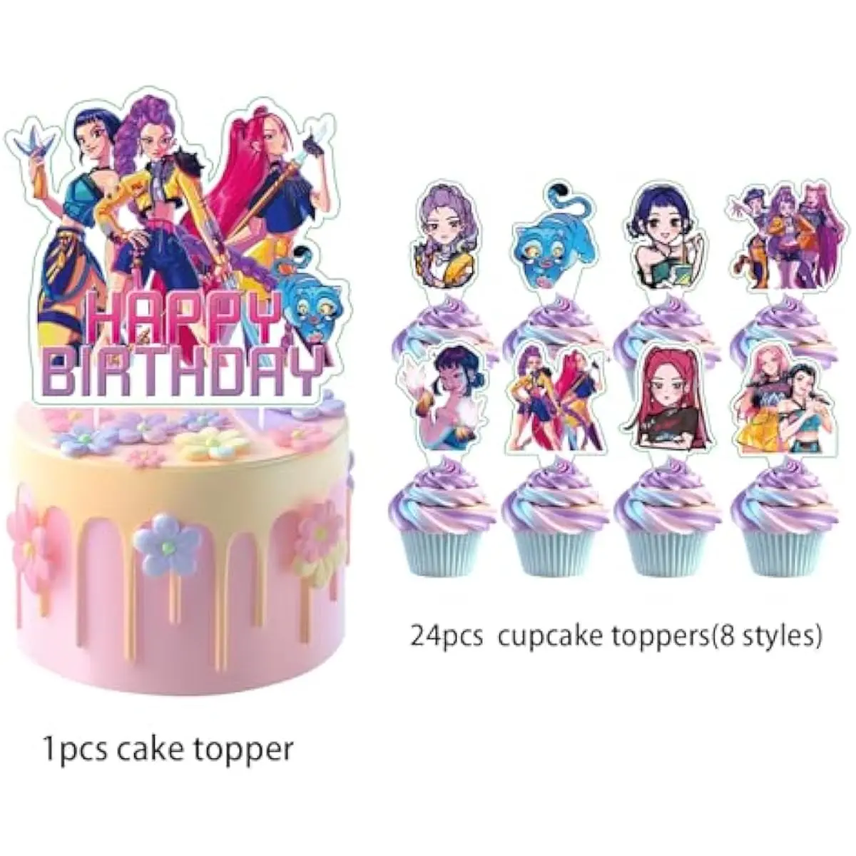 25Pcs Demon Movie Hunters Cake Decorations with 24pcs Cupcake Toppers, 1pcs Happy Birthday Cake Topper, Cartoon Themed Party Supplies, Perfect for Birthday Party Decorations