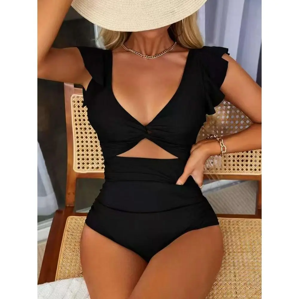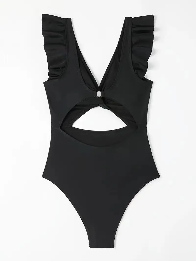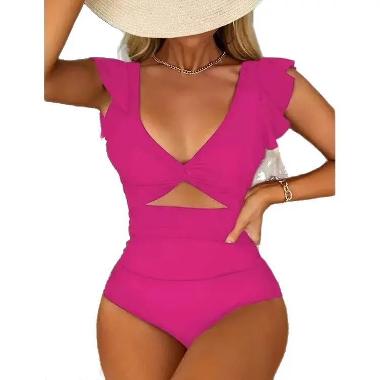 European and American style solid color sexy ruffled backless high-waisted hollow-out one-piece swimsuit