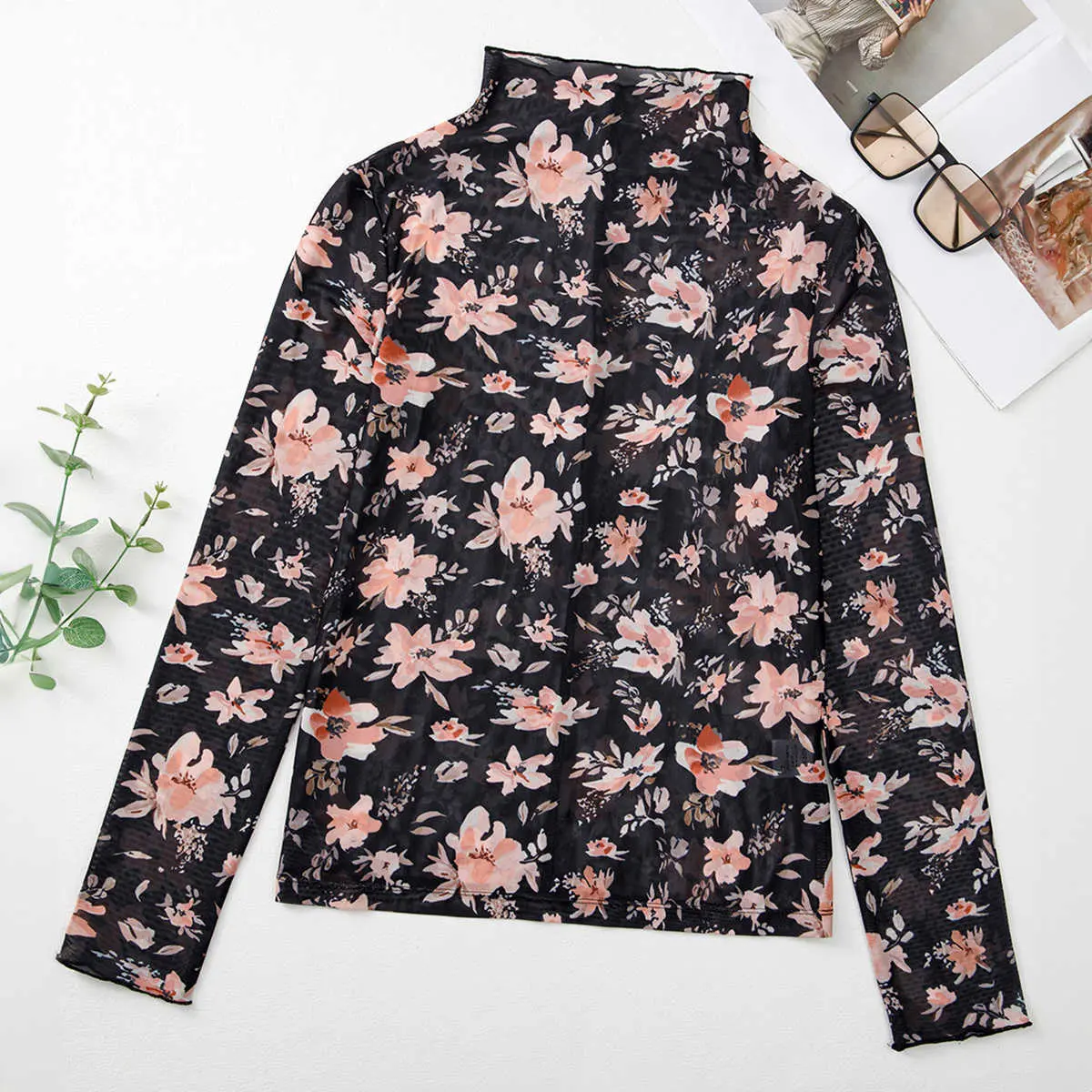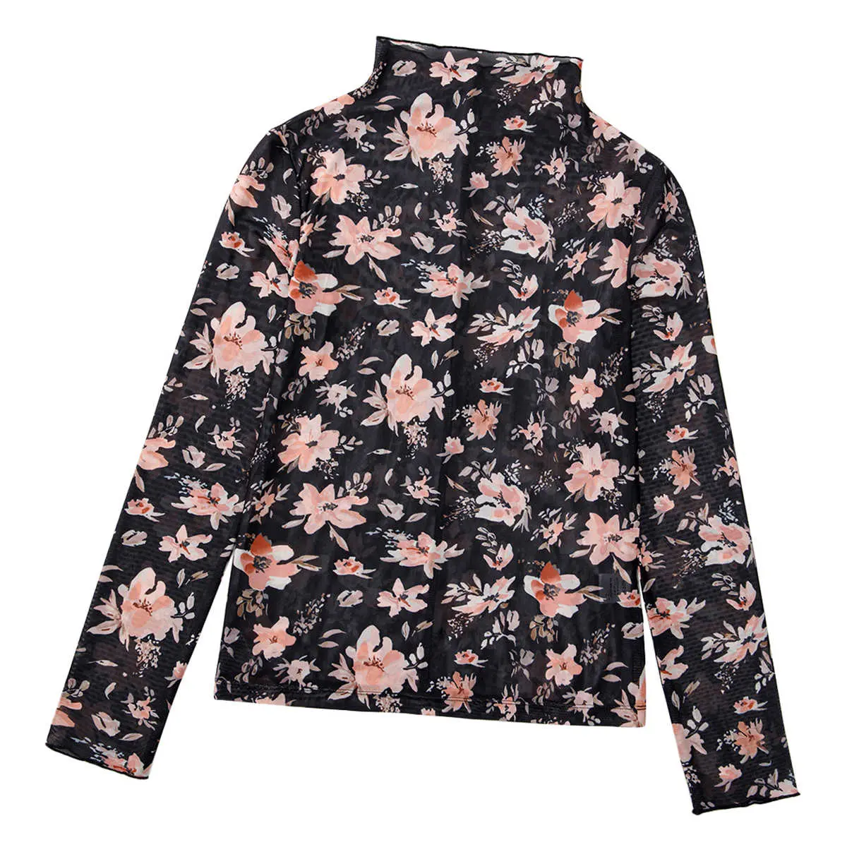 Black Floral Mesh Mock Neck Long Sleeve Slim Fit Top