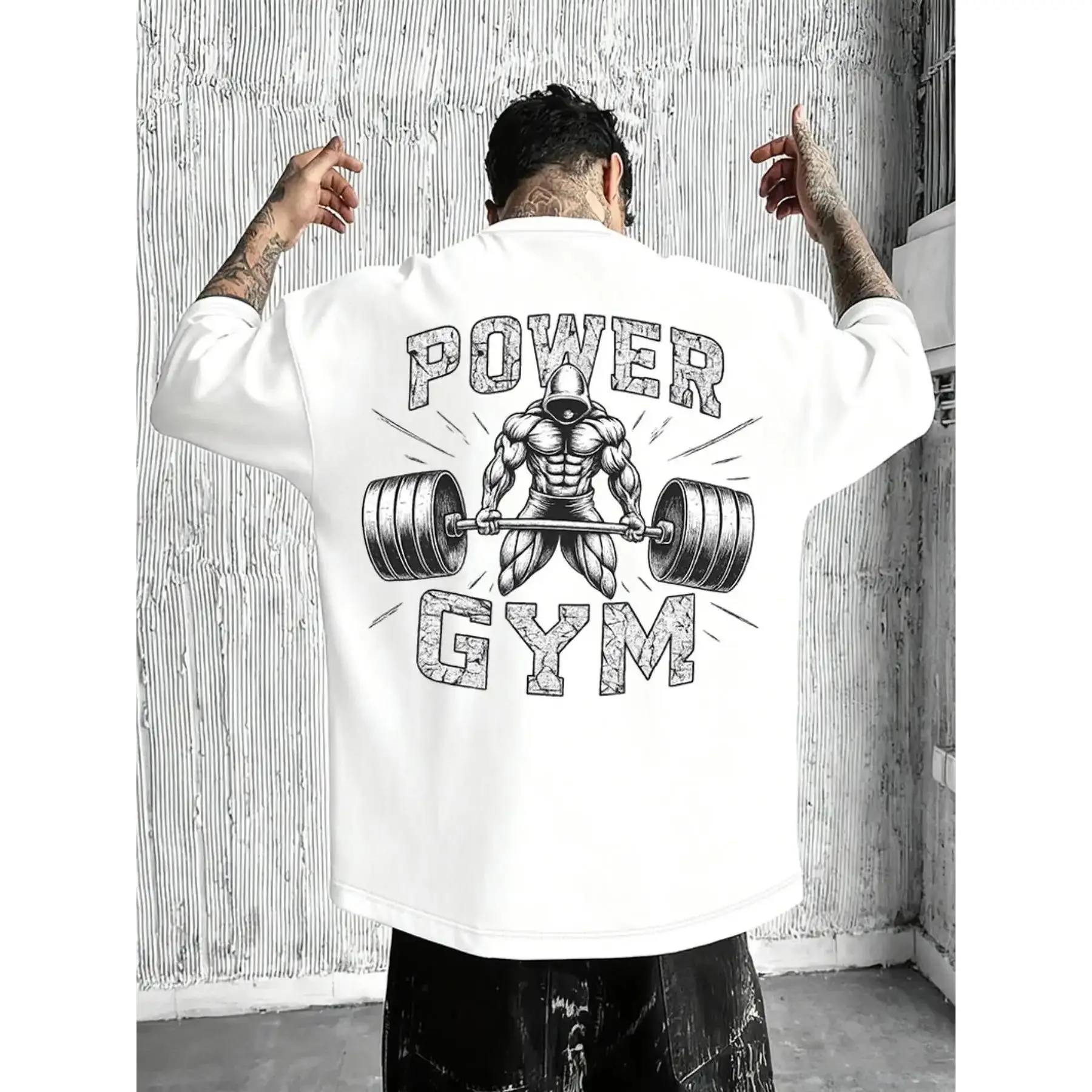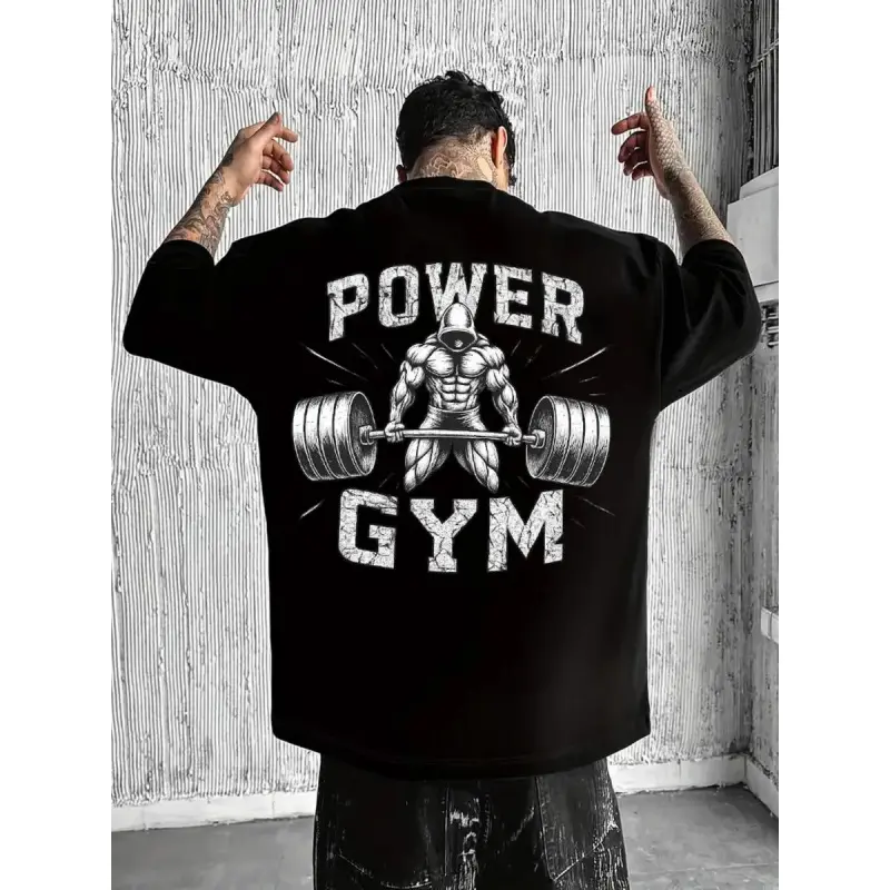 Men's Cool "Power Gym" Bodybuilding Graphic T-Shirt: Black Oversized Tee with Weightlifting Print, Perfect for Fitness Enthusiasts and Street Gym Style
