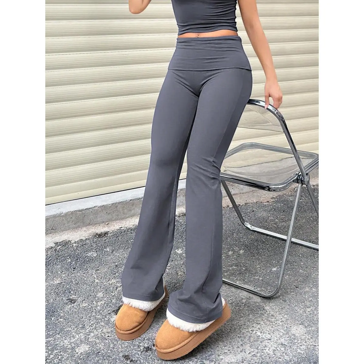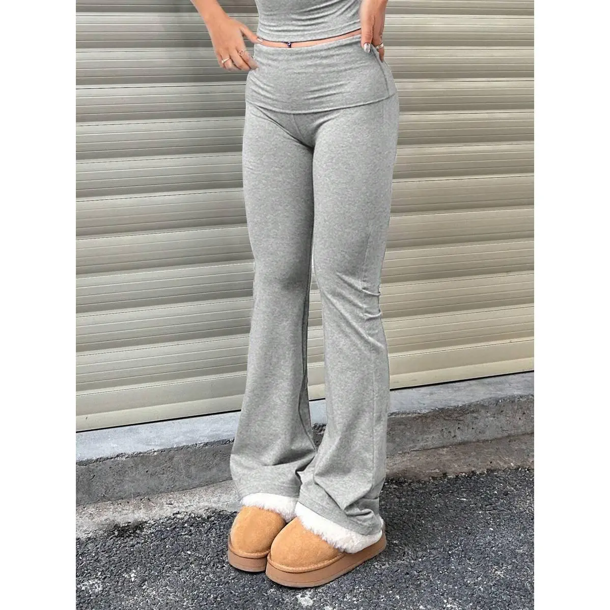 Ciel Fashion Women's Casual Solid Color Wide-Waist Flare Pants, Leggings Fold-Over Waist High Waist Ruched Slim Fit