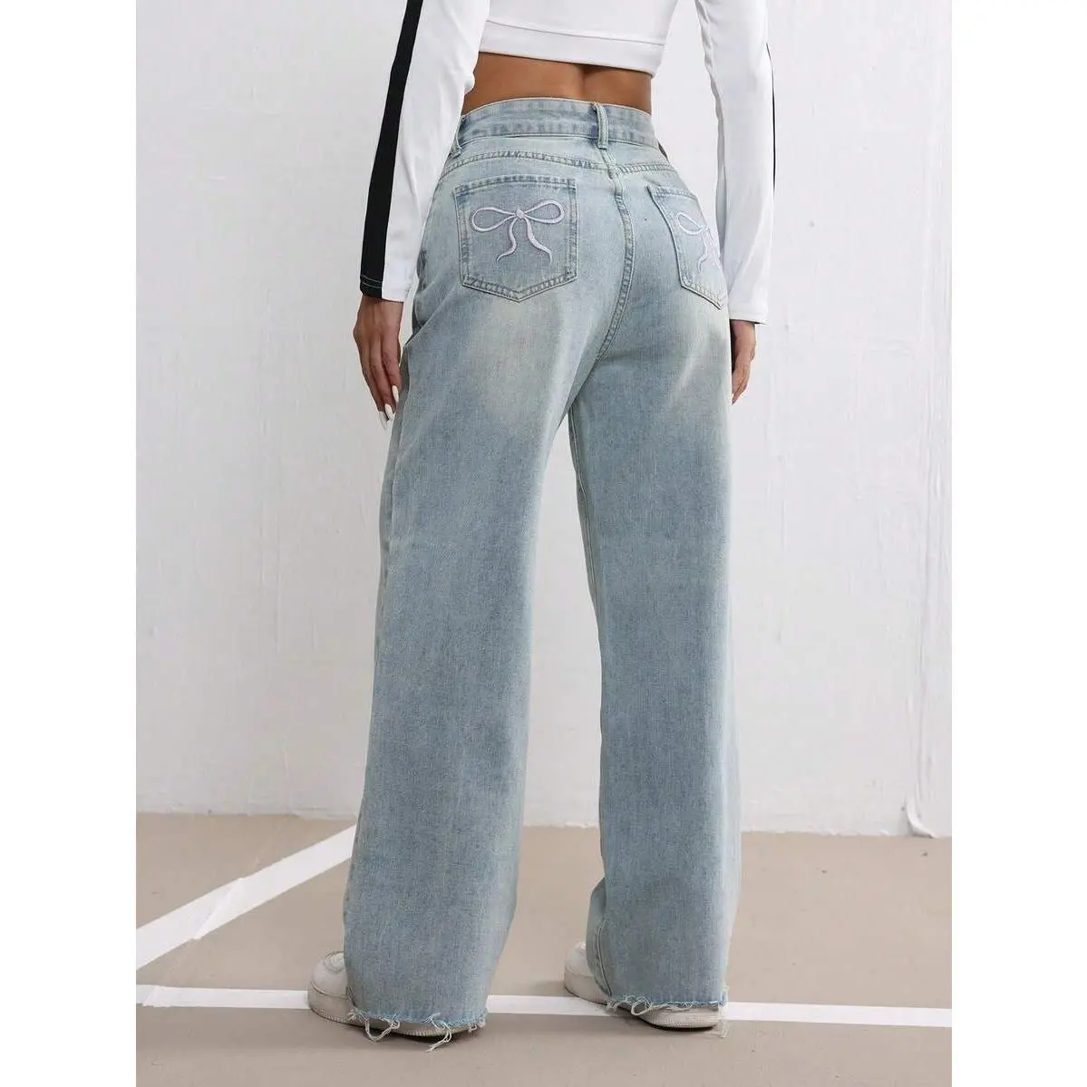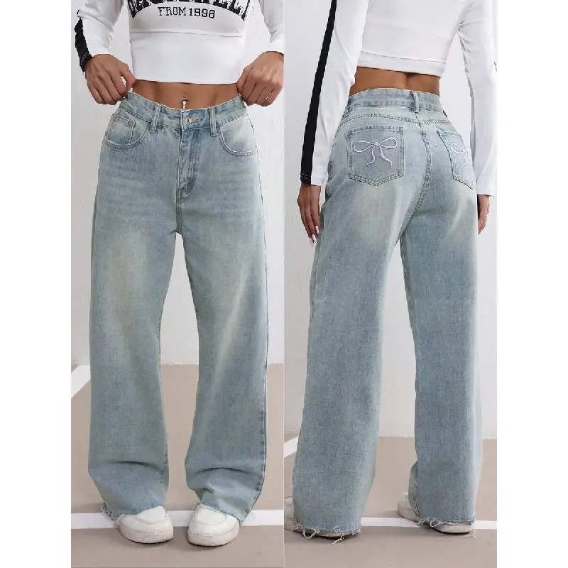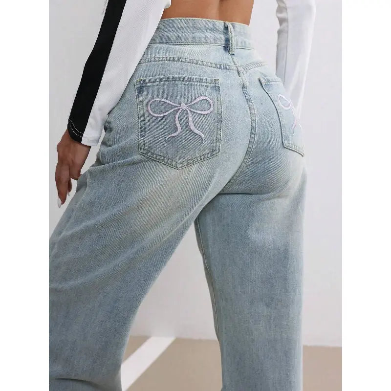 Ciel Fashion Bow Embroidered Jeans Women's Fall Design Sense Wash Blue Casual Straight Leg Loose Rough Edge Trousers