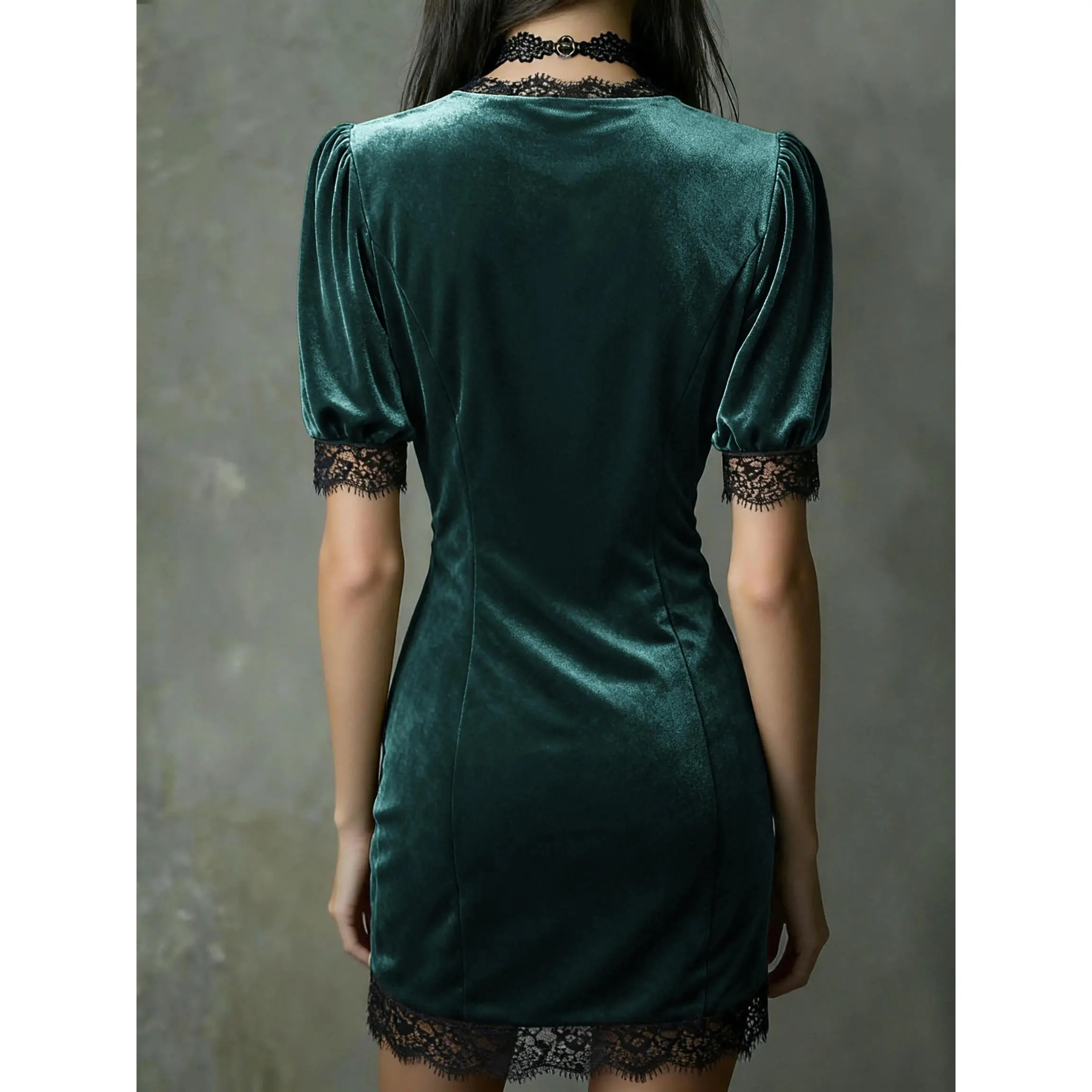 Directional Style+Velvet Lace V-Neck Slim-Fit Short Sleeve Dress, Suitable for Commuting, Casual Outings, and Various Occasions Like Dates