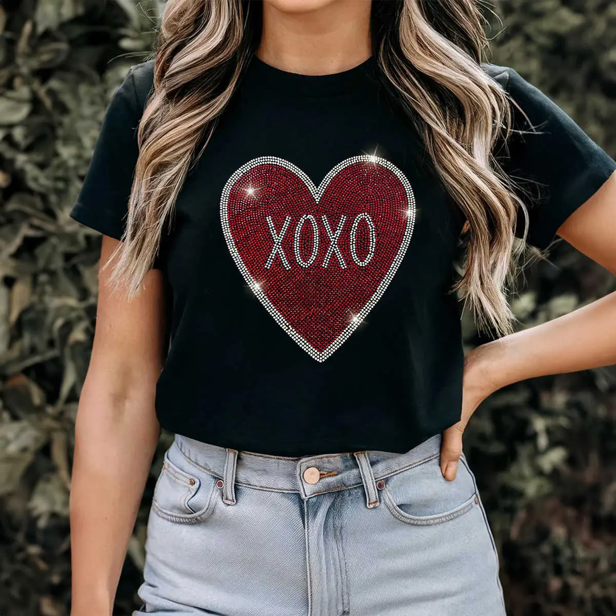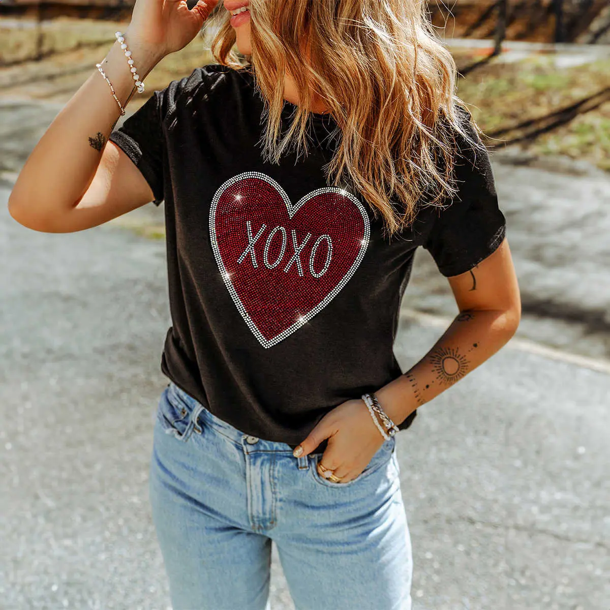 Black Rhinestone XOXO Heart Graphic Crewneck Tee