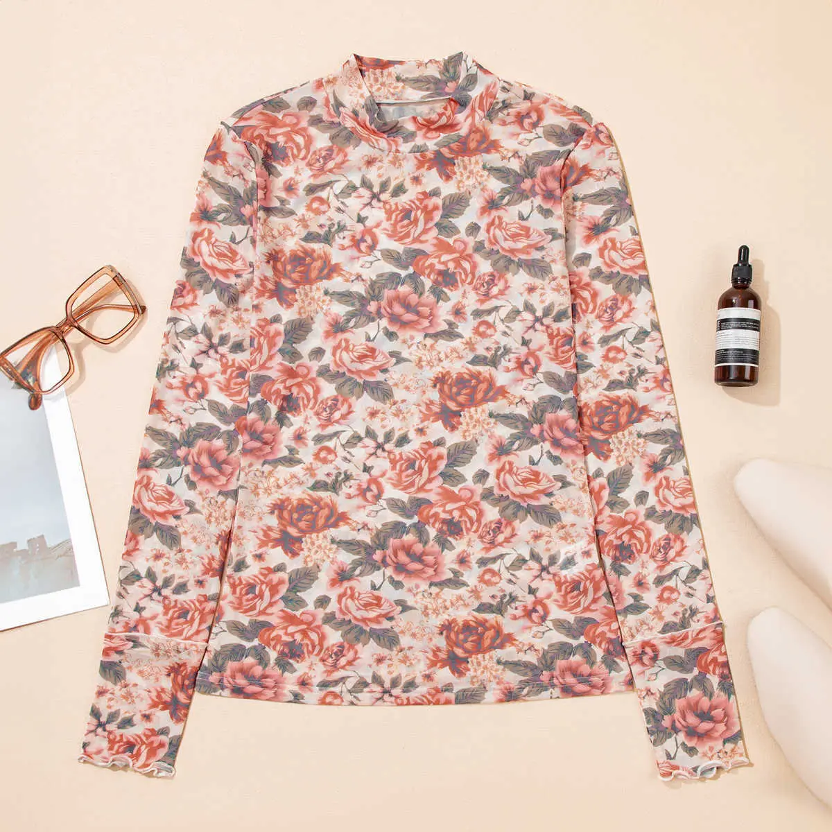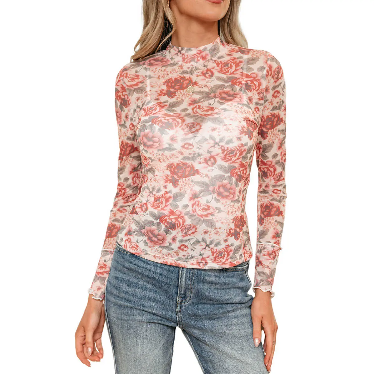 ·This slim fit long sleeve top friendly hugs your sexy curve.The all over floral pattern gives a mesmerizing look.The mesh fabric makes this floral top elastic and comfy.The lettuce trim adds feminine delicate detail.