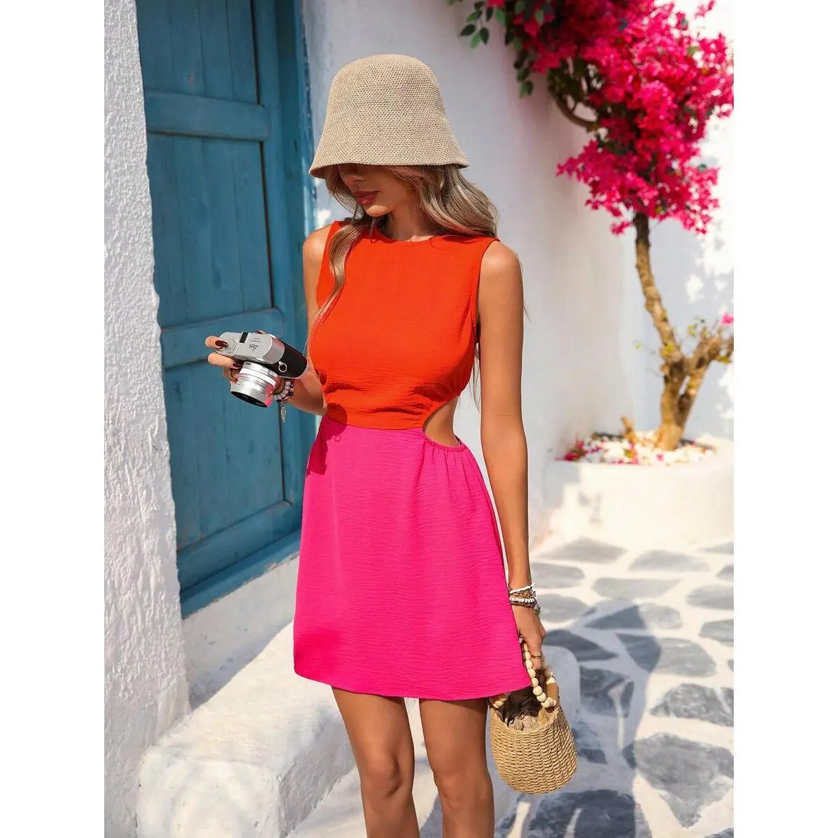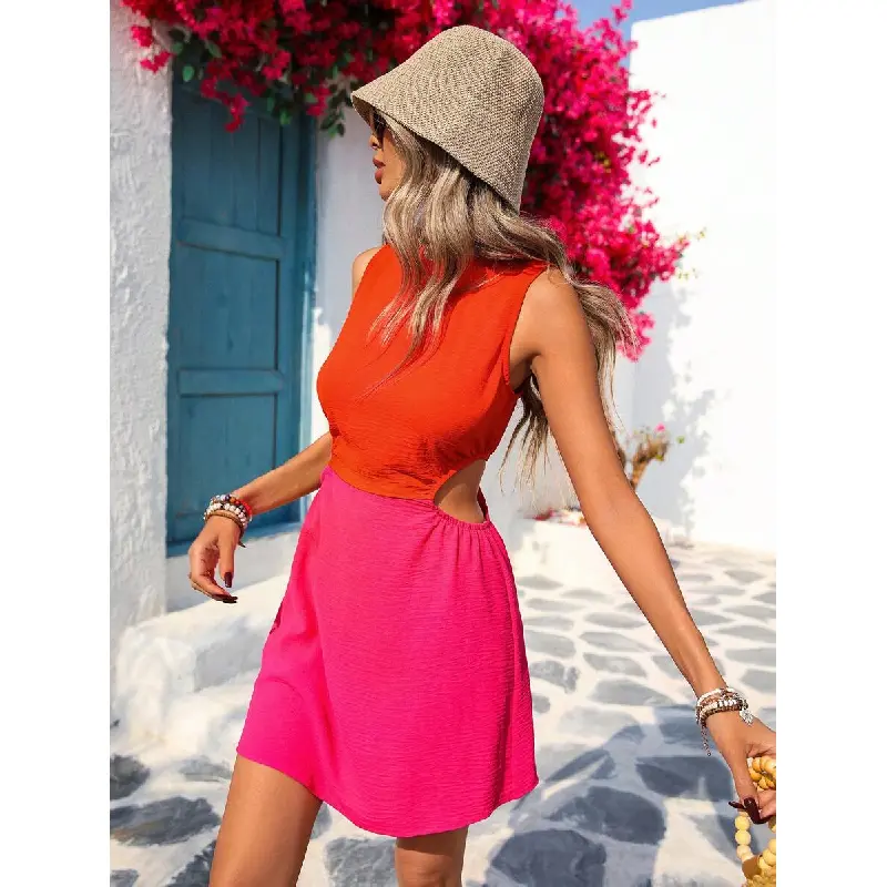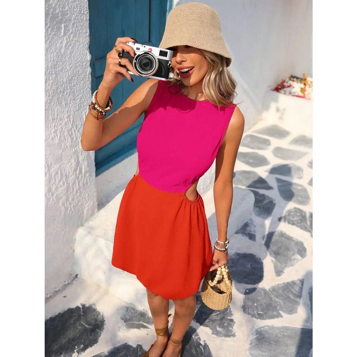 Ciel Fashion Color Block Cutout Waist Women's Mini Dress, Summer Clothes, Valentine's Day, Vacation Outfits Woman, Beach Outfits For Woman, Festival, Romantic, Bohemian, BOHO, Sweet, Rave Outfits Festival, Tropical Vacation Woman Clothes ,Vacation Outfits