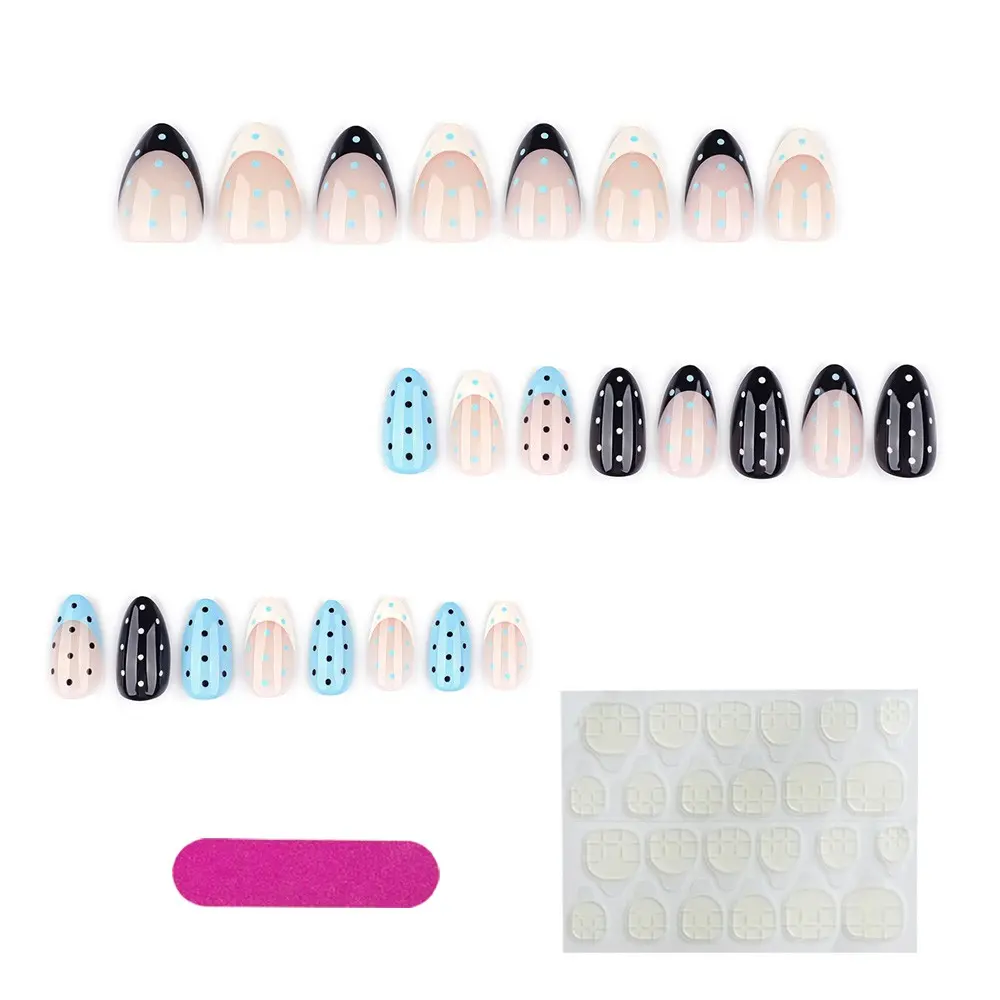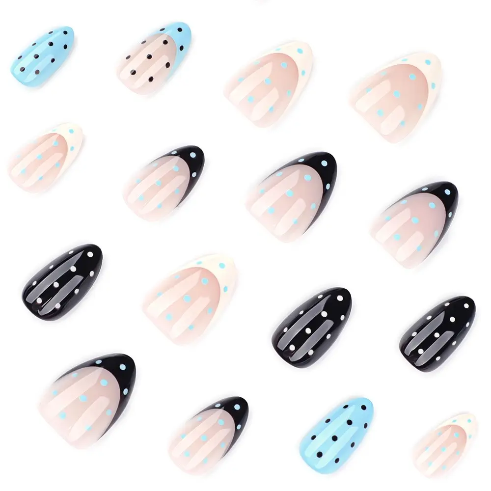 24pcs Short Almond Nail Tips Round Dot Pattern Removable Fake Nails Half Handmade Design Includes Nail File Jelly Glue