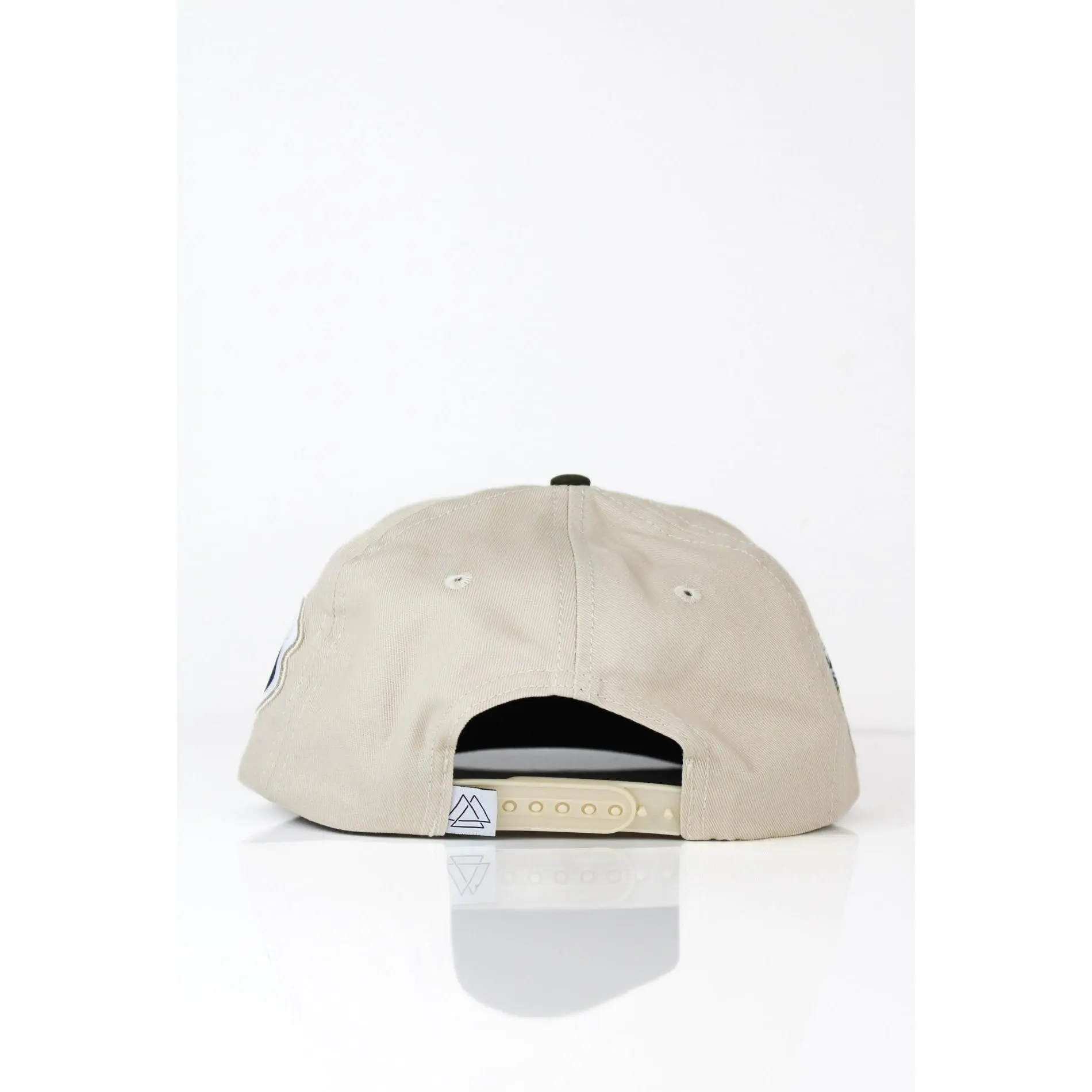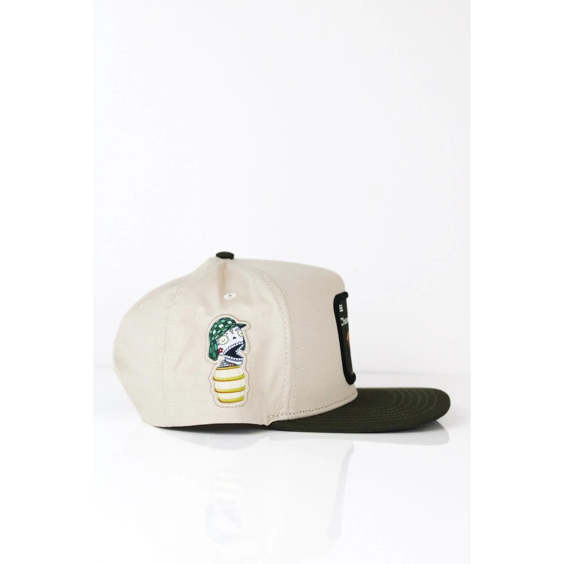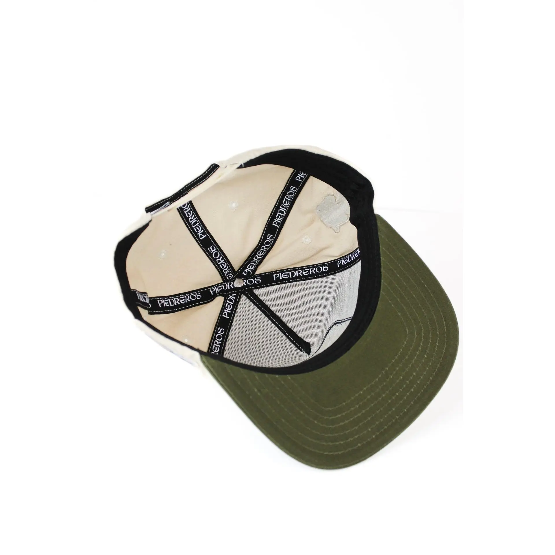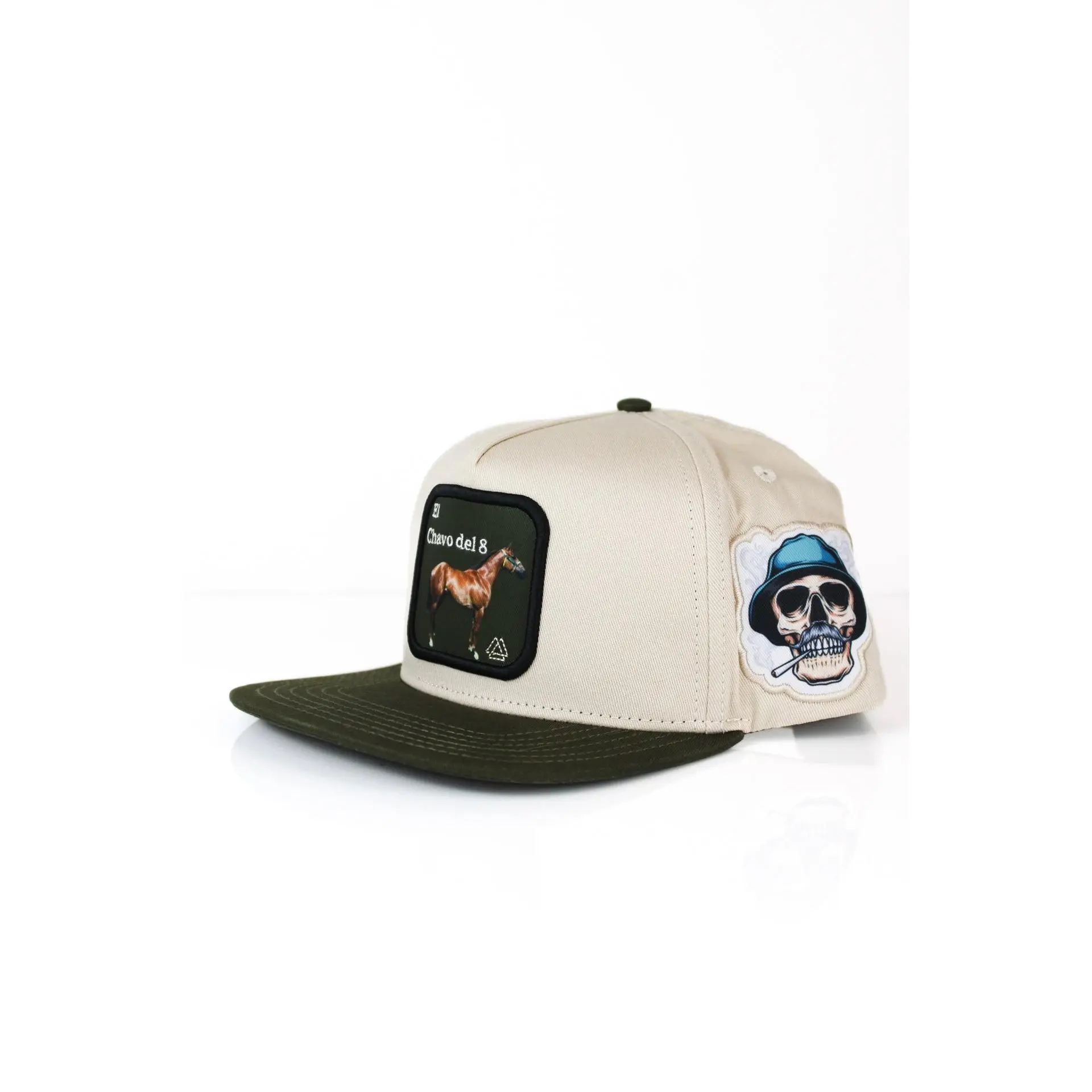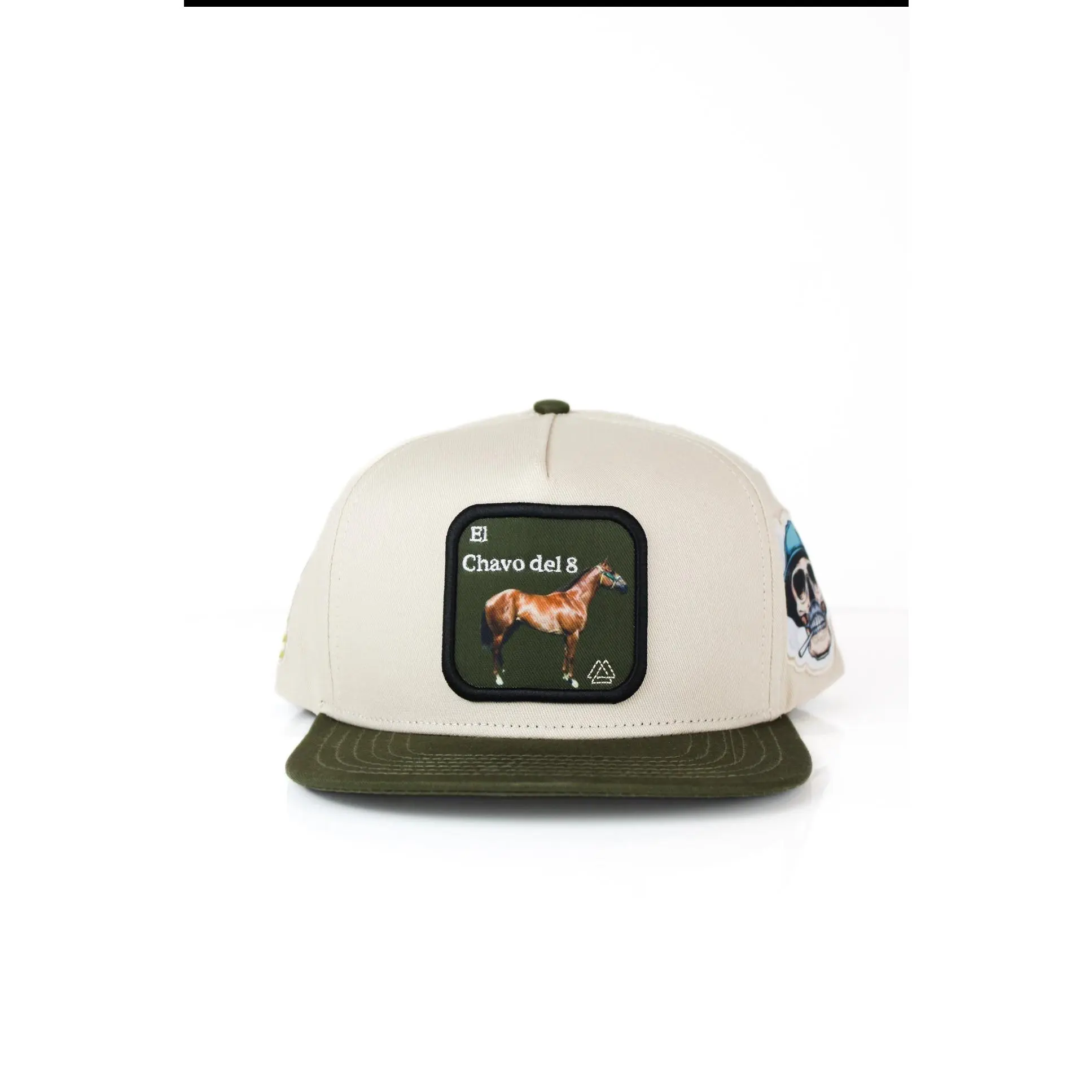 A sleek beige and forest green hat with 3D embroidered iconic horse. Both sides of hat contain famously know icons and nickname.
