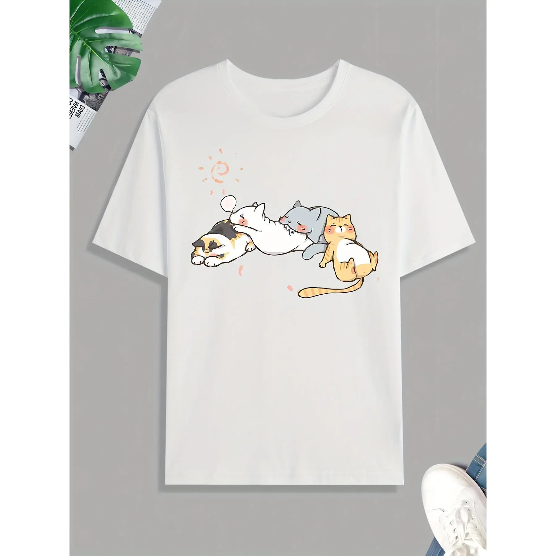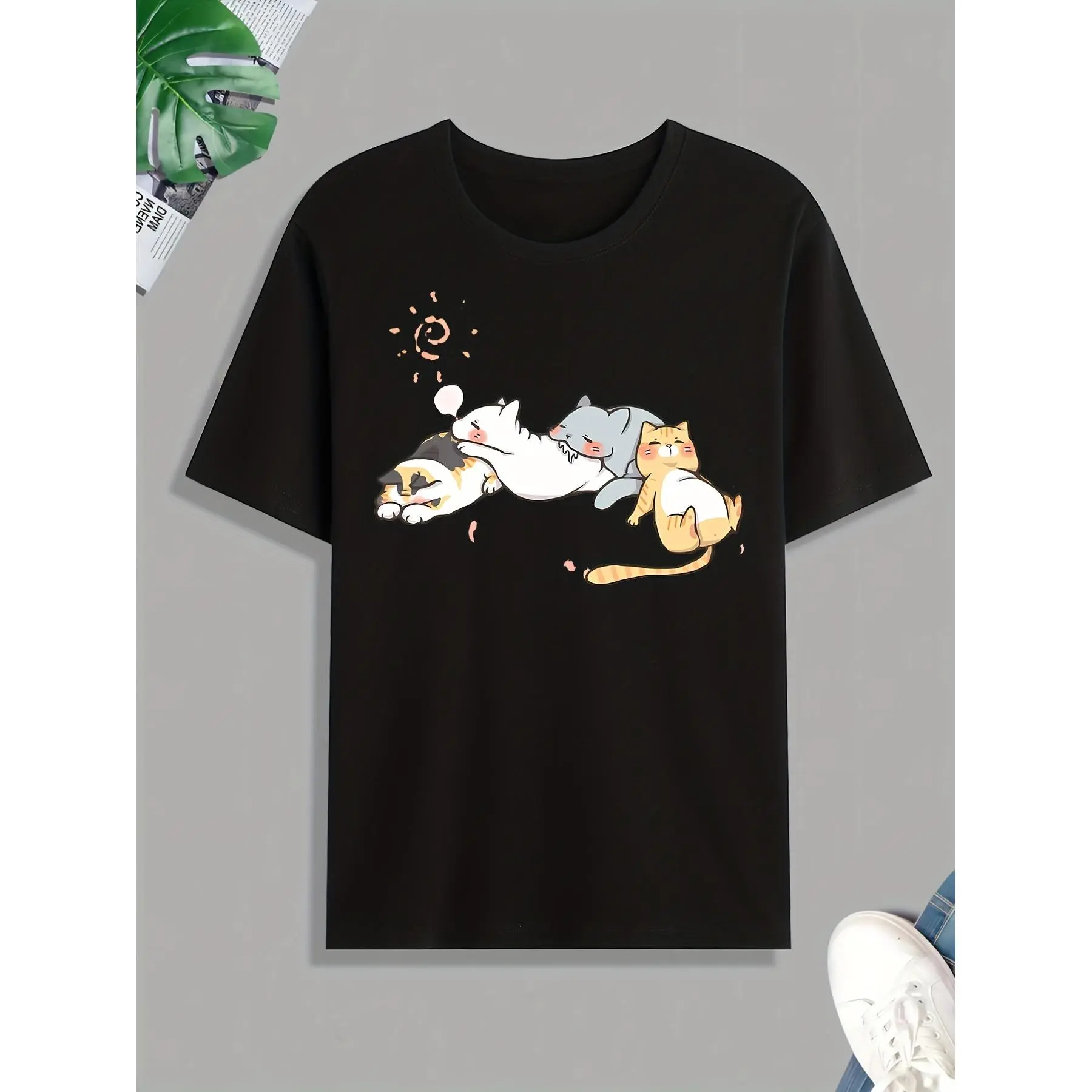 Men's fashionable casual printed short-sleeve T-shirt with cute cat illustrations, comfortable crew neck T-shirt for summer outdoor sports