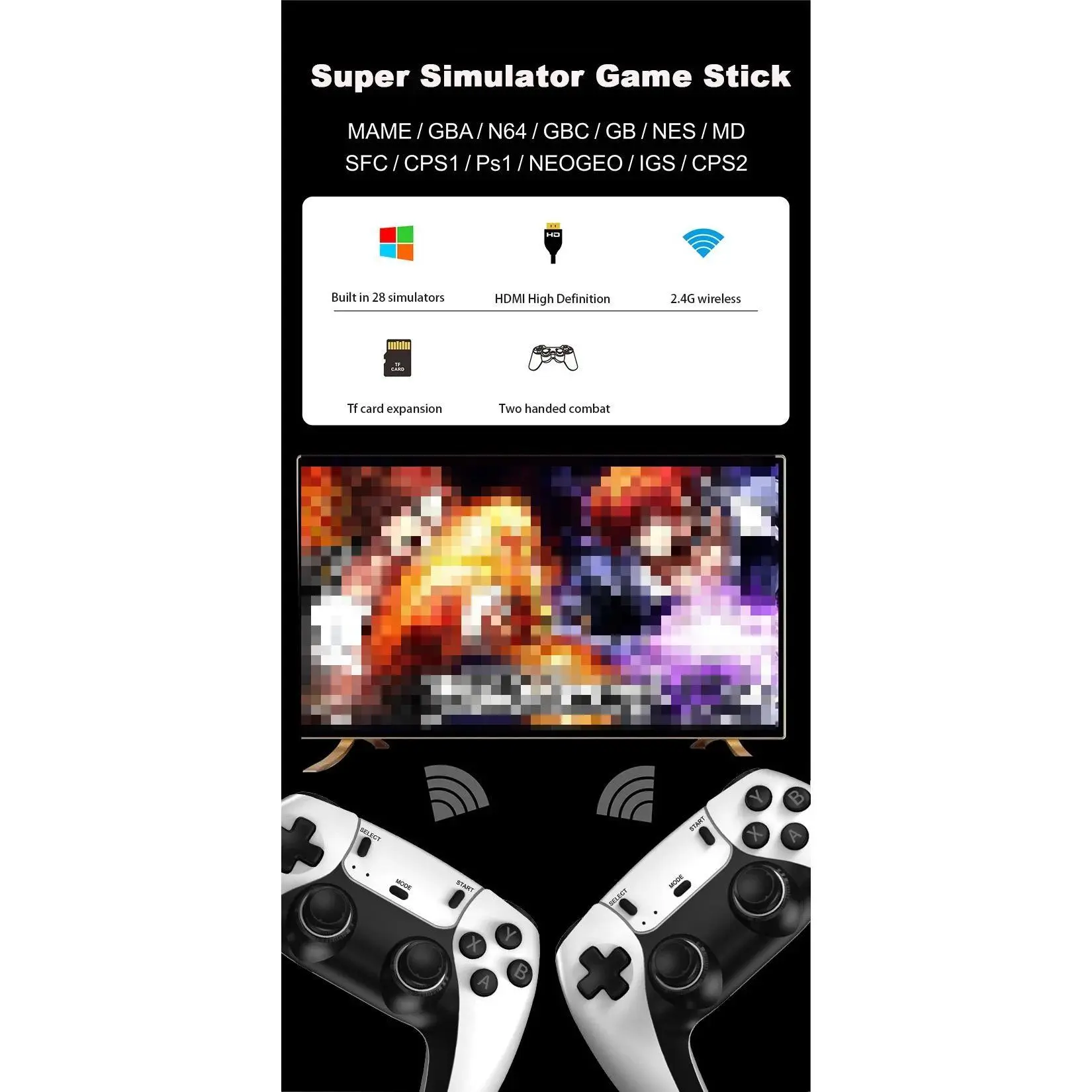 Multiple emulator formats:For ps1/atari/mame/sfc/fc/gba/gb/gbc/md supports emulators. With dual wireless gamepads, the icing on the cake.