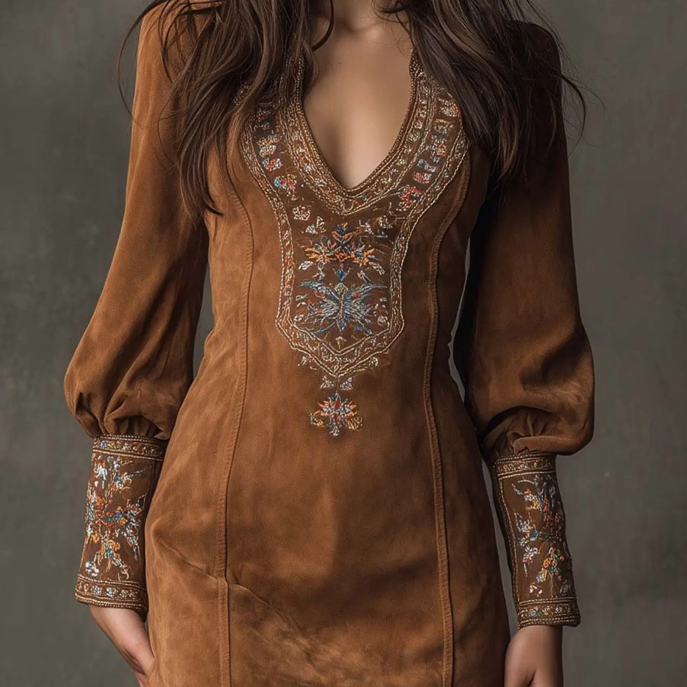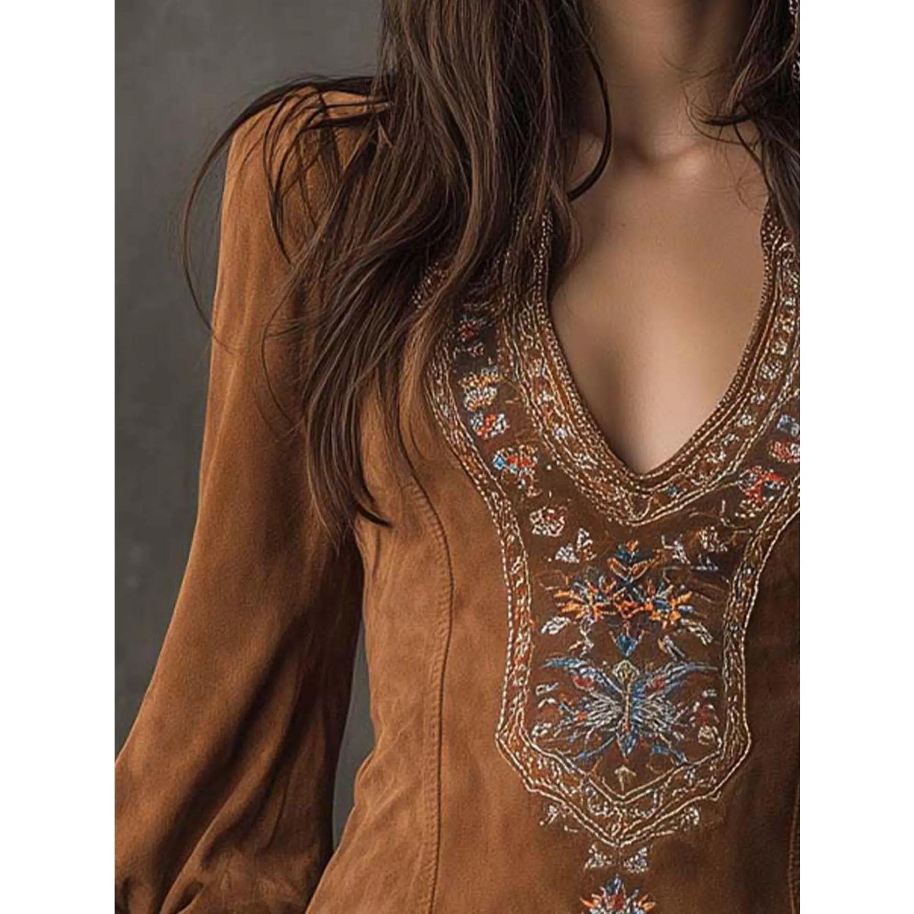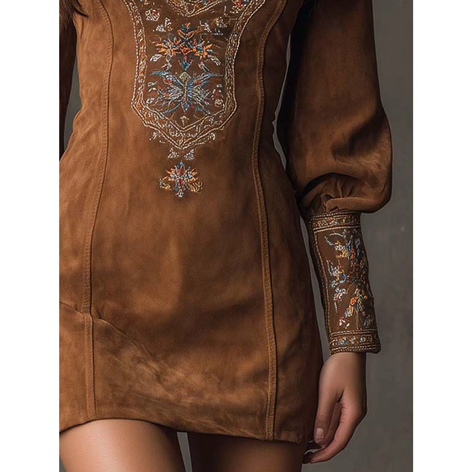 Women's Vintage Bohemian Skirt - Caramel Brown Heavy Embroidery V-Neck Short Skirt with Lantern Sleeves, -Line Pencil Skirt Suitable for Vintage Parties, Weddings & Themed Events