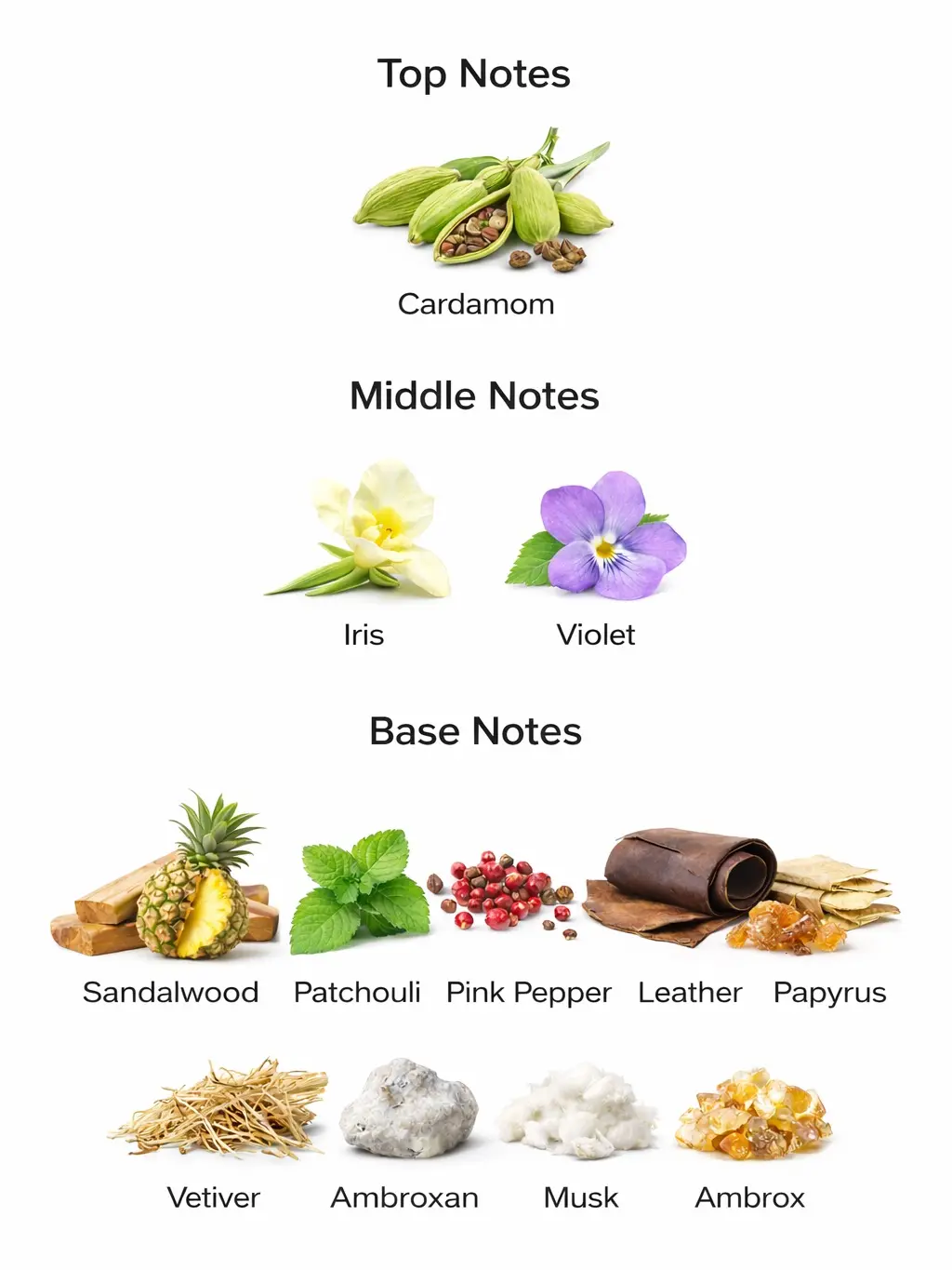 Base : Sandalwood, Cedarwood, Leather, Papyrus, Musk, Ambrox