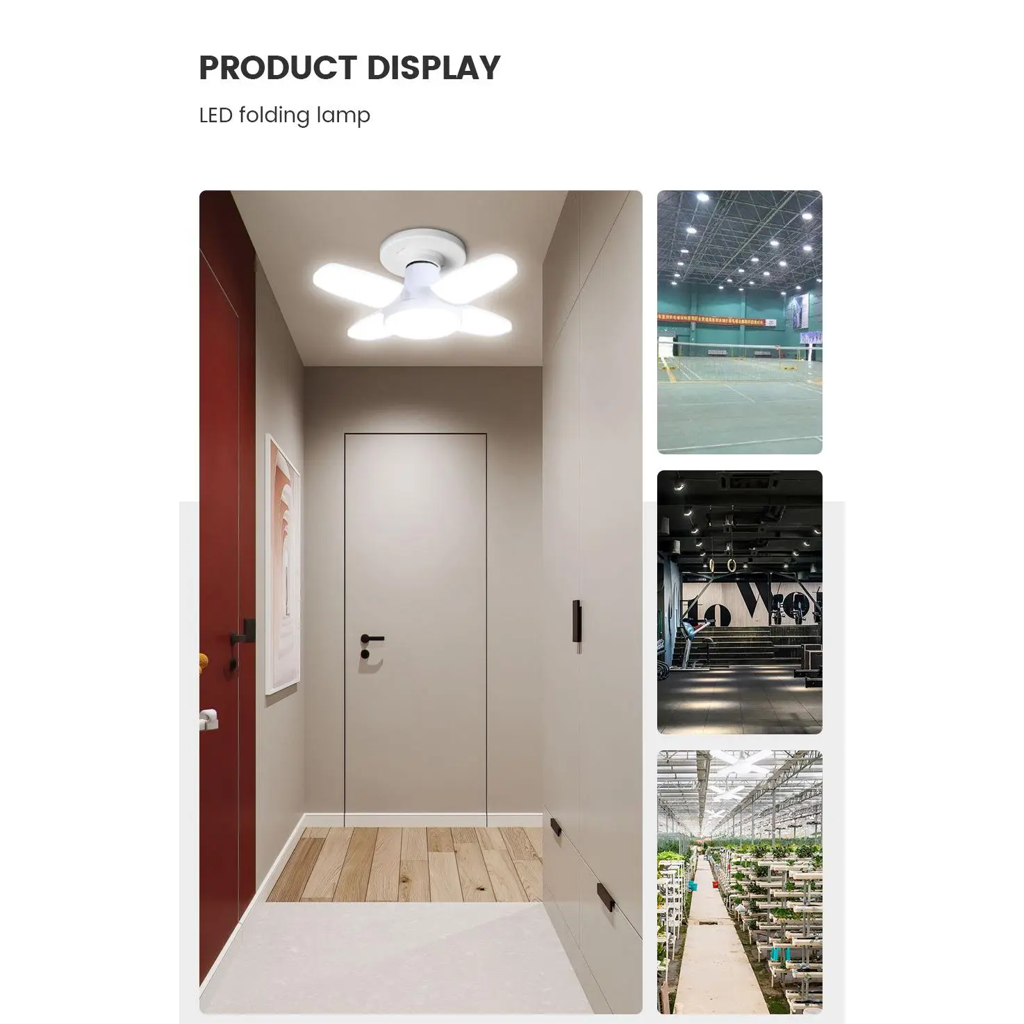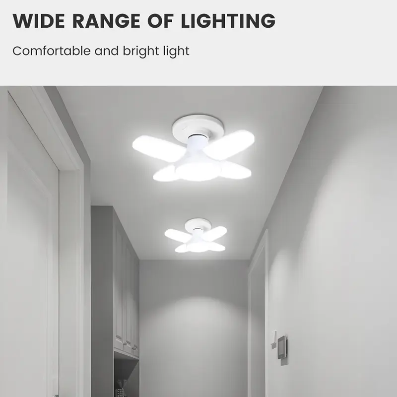 Size: 6.5*9.2cm(fold); 8.5*19.5cm(unfold) Lamp base: E27 Color Temperature: cold white (6000-6500K) Material: PC + ABS Feature: Super Bright: Foldable Fan Blade LED Lamp will provide comfortable light. With It can be used as a ceiling light which looks simple, elegant and nice. Energy Saving: It can save more than 80 percent energy which compared with traditional incandescent lights.The light life time will be last more than 20,000 hours, so you won't worry will replace the light frequently. Wide Application: The led light bulbs are widely used for home lighting. Especially working as a night light for closet, cabinet, corridor,bathroom, workshop, basement, garage, stairs, roof, door, garage entrances and other storage areas.