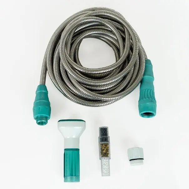 Welcome to another watering season -- one that's handled by the hassle-free expandable metal hose from Bernini, with an upgraded adjustable spray nozzle featuring a Clear Flo Filter. Not only does the hose resist kinking, punctures, corrosion, and UV rays, but it now helps filter out sediments and contaminants and reduce unpleasant odors.