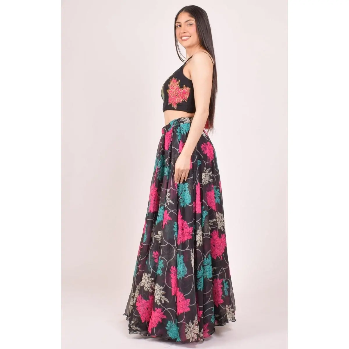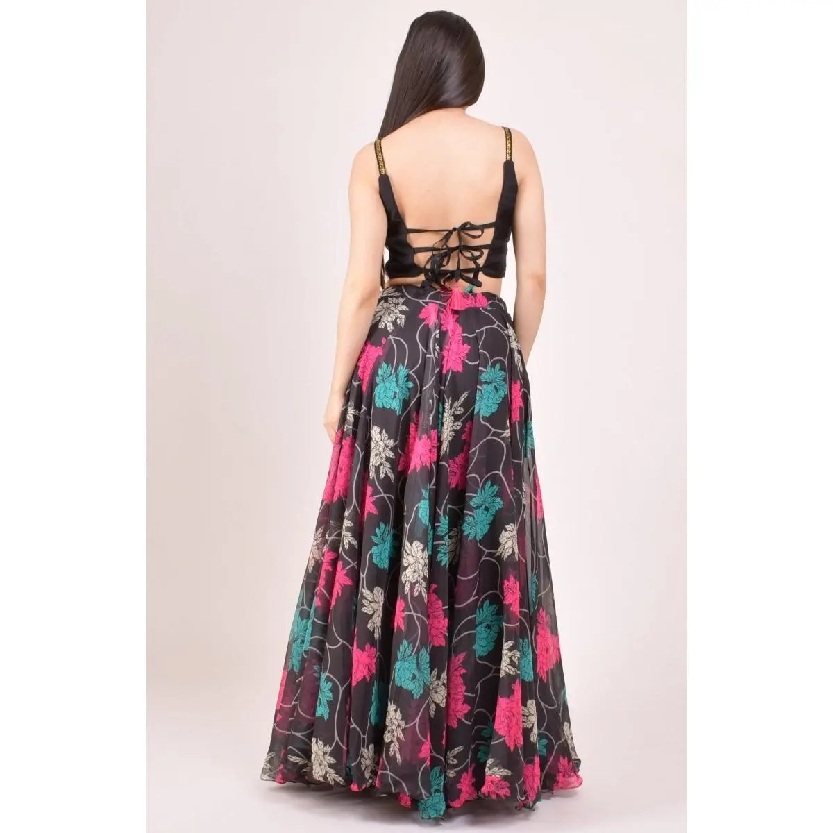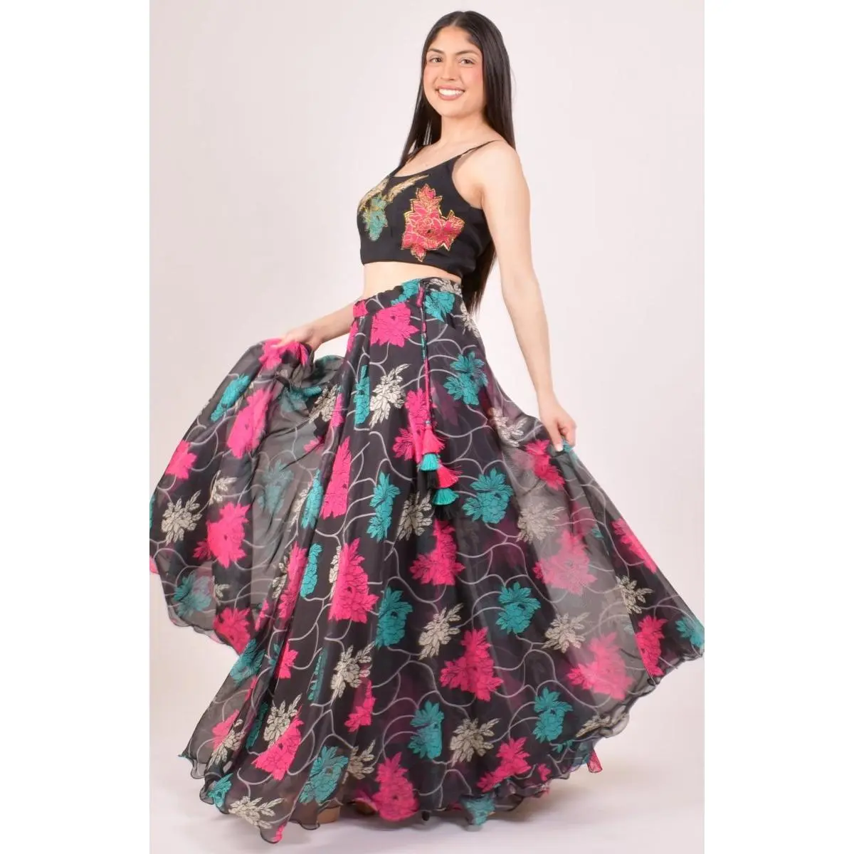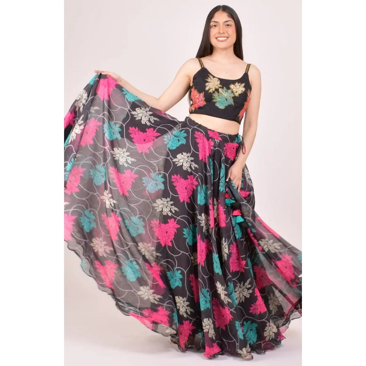 A bold black lehenga choli that commands attention — this three-piece ensemble pairs striking zari embroidery with a vibrant all-over floral print for a look that's equal parts traditional and contemporary. The organza blouse features handcrafted zari floral motifs in pink, teal, and gold with a lace-up back closure, while the matching printed organza chaniya carries the same bold floral design for a cohesive, festive finish. A lightweight black georgette dupatta with tassel detailing completes the set with effortless grace. The perfect black chaniya choli for Garba nights, Sangeet, and wedding celebrations — a standout look that moves beautifully on the dance floor.