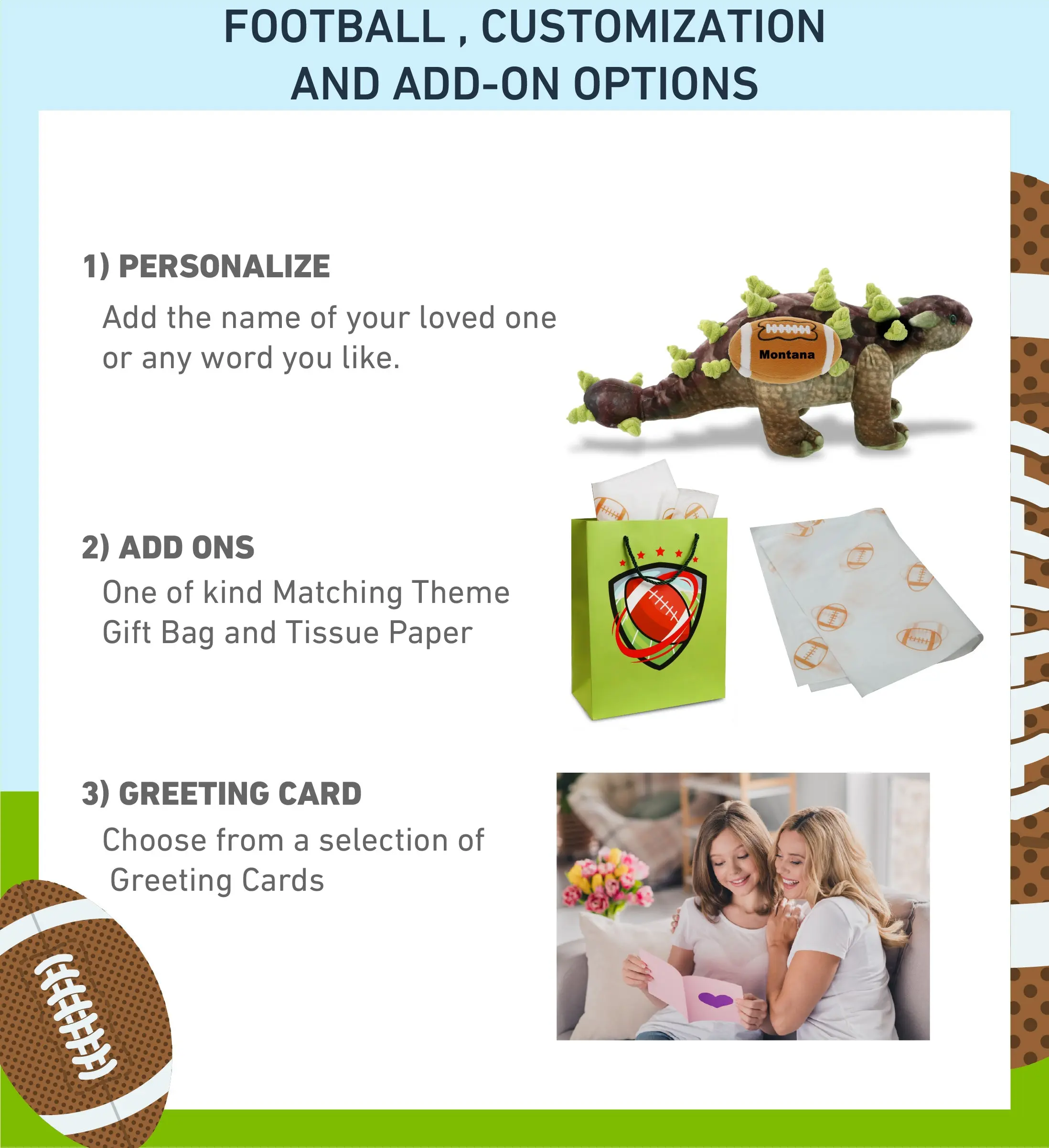 ·Personalization, Customization, and Add-On Options - This Super Soft Sports Stuffed Animal Wild Collection Ankylosaurus Dinosaur Plush comes customized with a football plush. You can personalize it with the name of your loved one imprinted on the item. You also have the option to add some or all of the cool add-ons to make your gift extra special: 1) Gift Bag; 2) Tissue Paper; 3) Greeting Card.