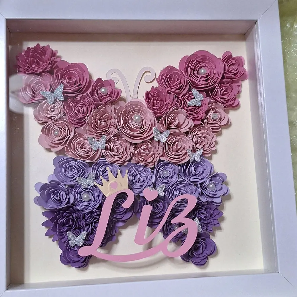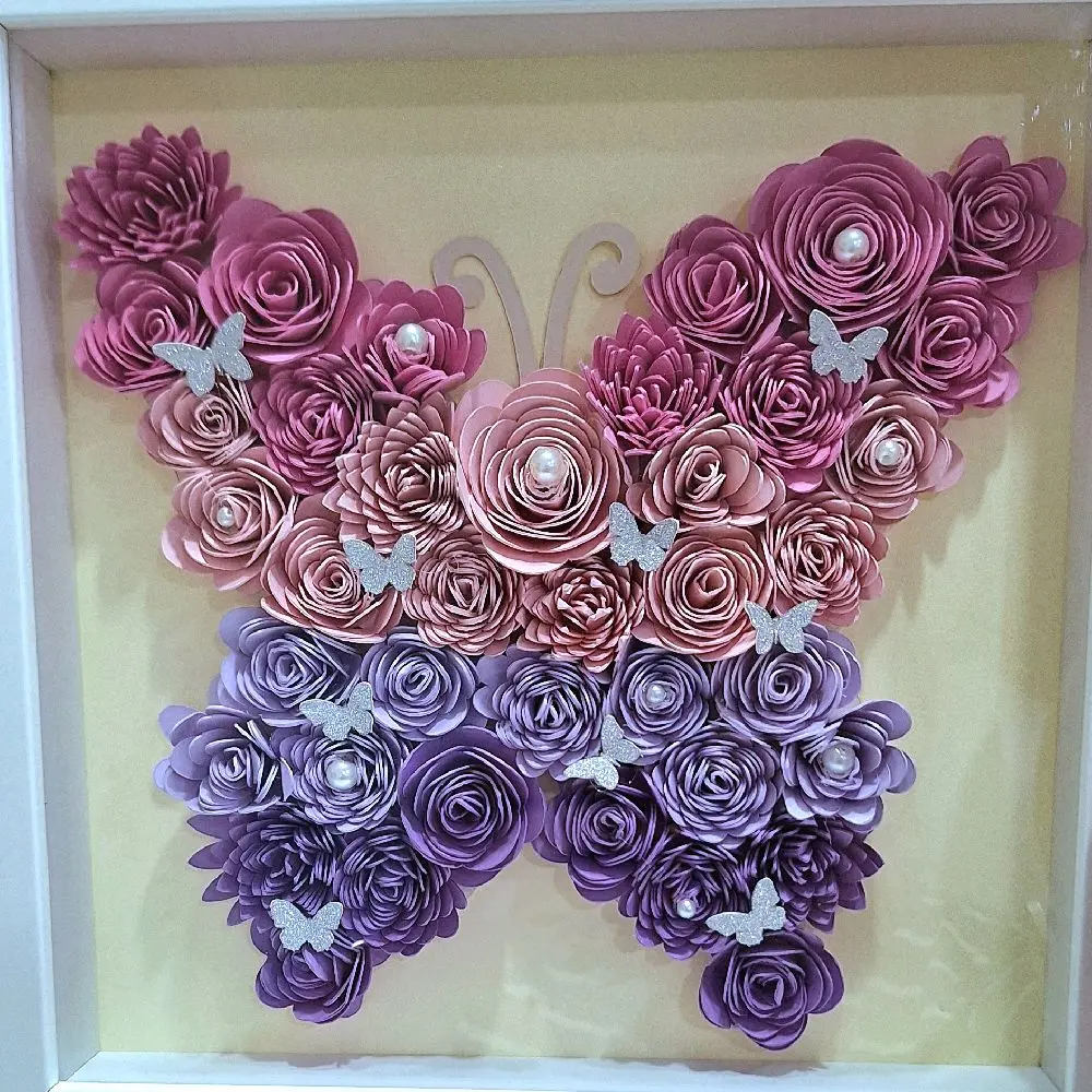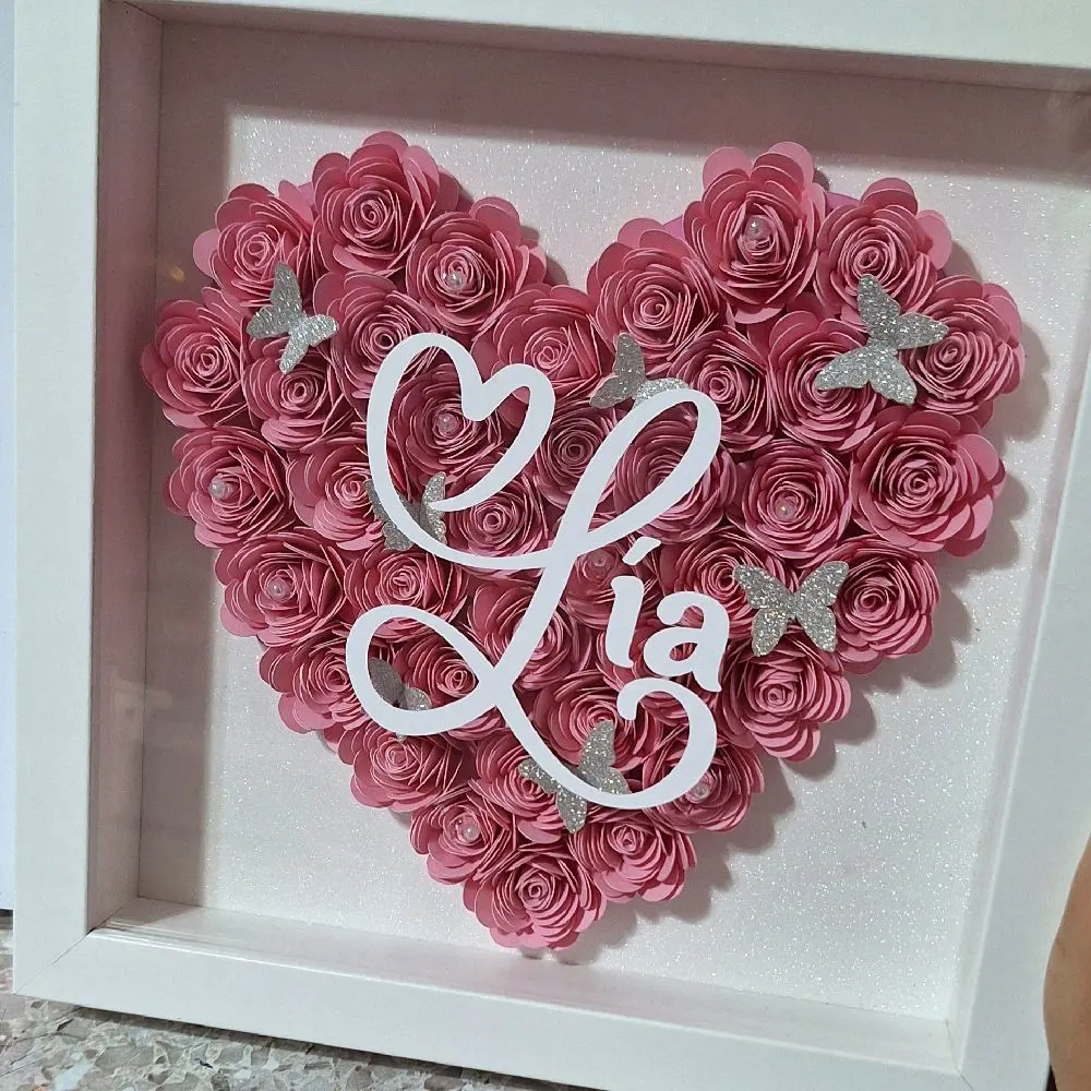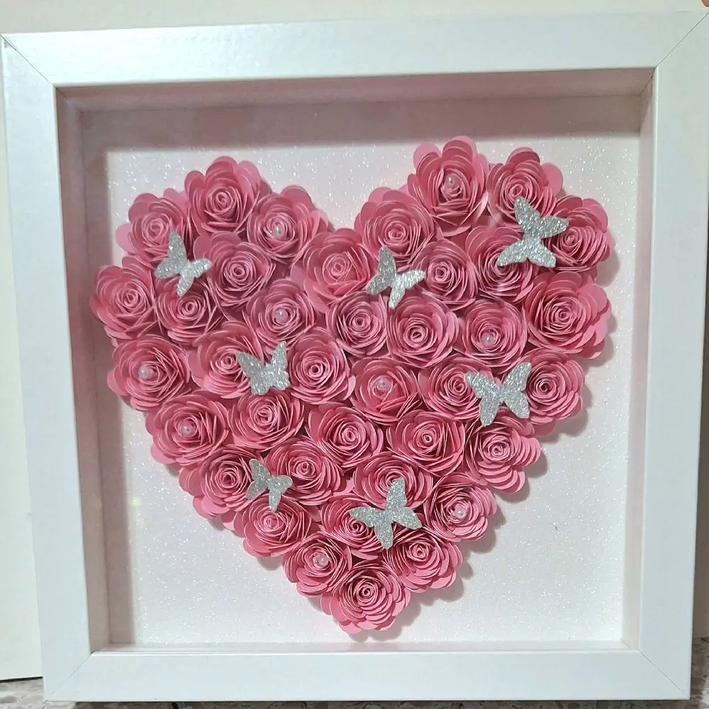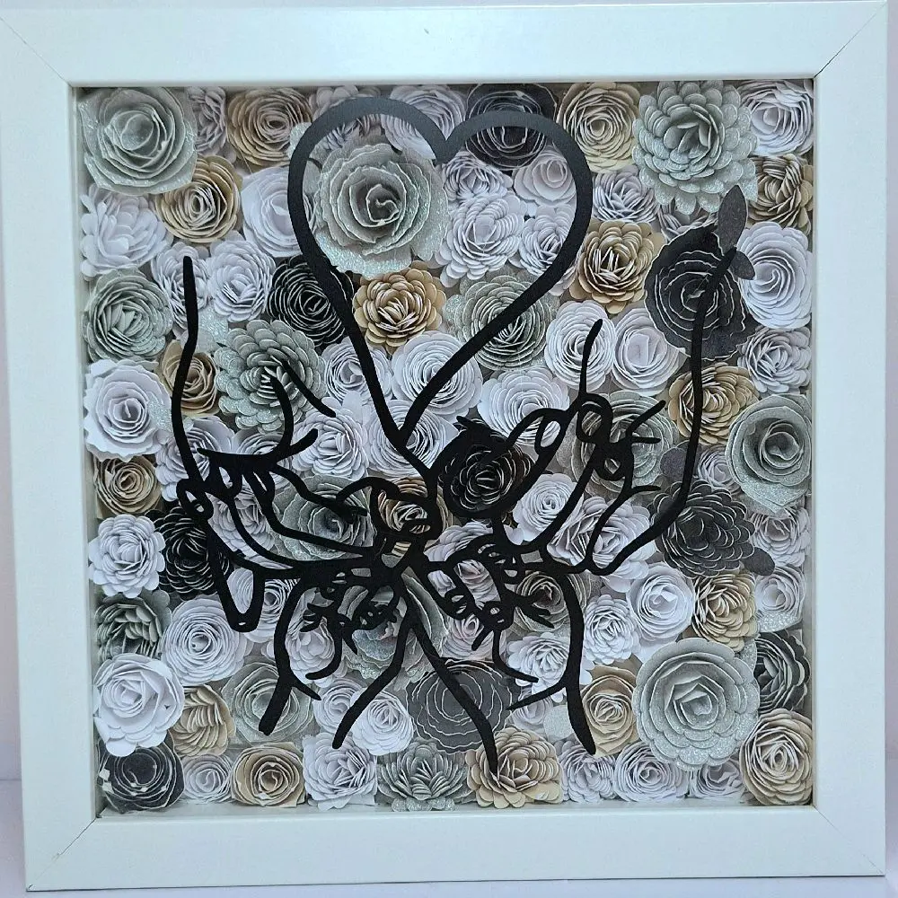 Each shadow box is unique. They can be filled entirely with rolled flowers, feature specific shapes, or incorporate various types of flowers.