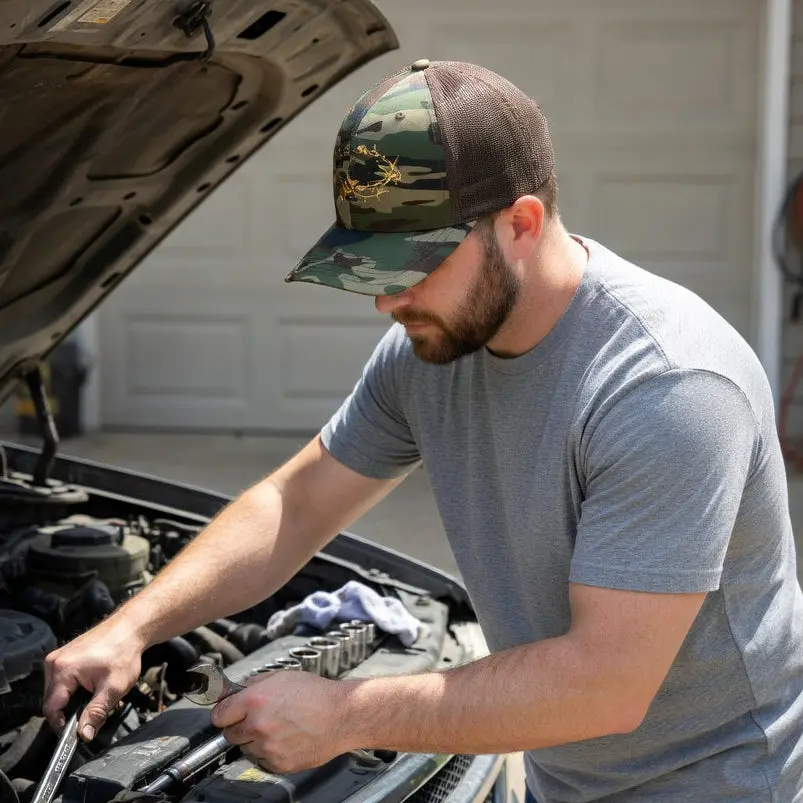 Dark Tactical – Edgy and stealthy with black mesh. The high-contrast camo lets the gold crown shine against deeper tones for a bold, no-nonsense look.