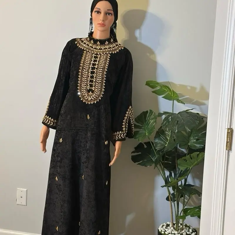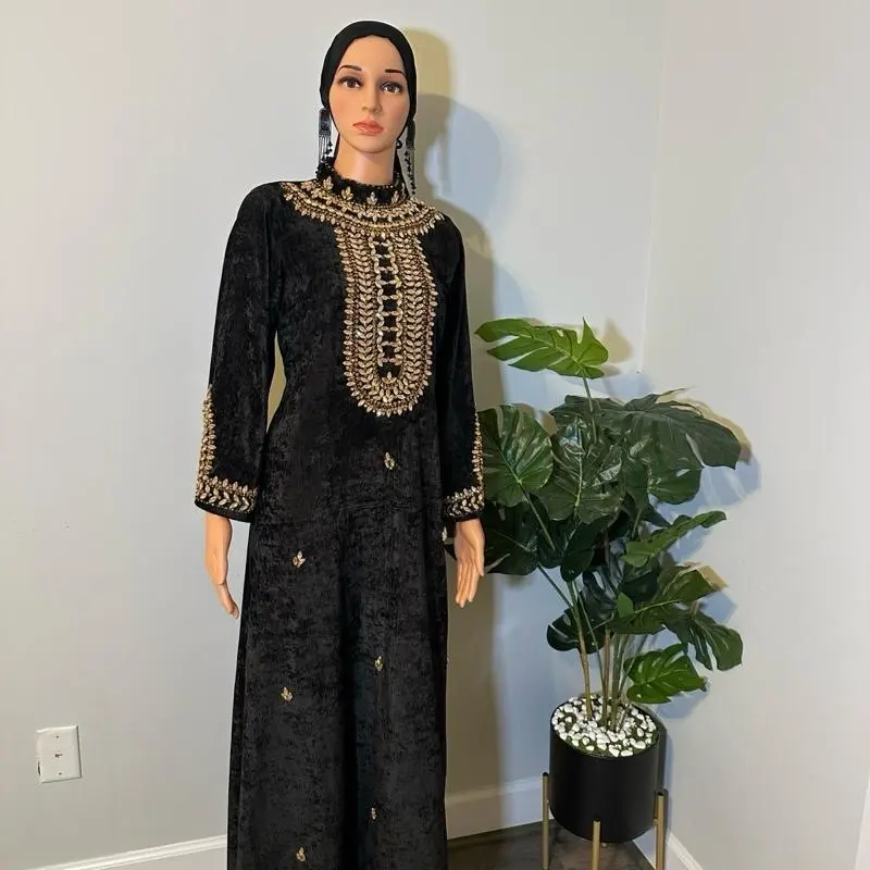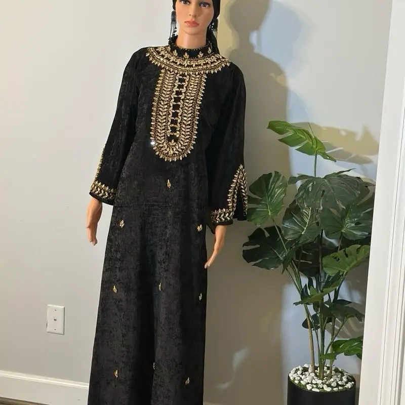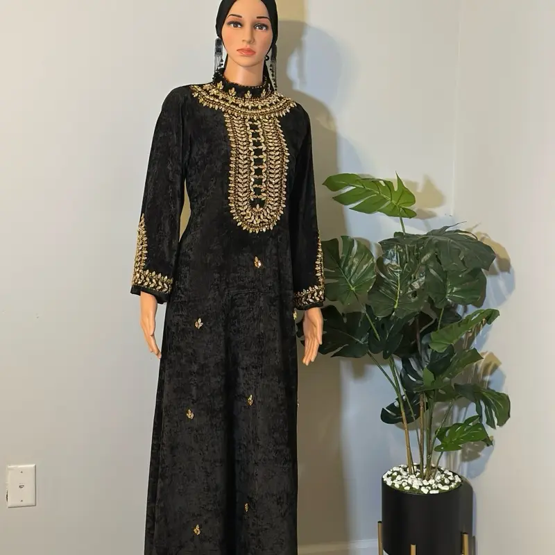 Introducing a masterpiece by Rovelle Fashion, this black velvet dress exudes elegance. Intricate gold embroidery adorns the neckline and sleeves, adding a luxurious touch. Crafted from soft, high-quality velvet, it offers comfort and a graceful silhouette. The gold detailing provides a subtle shimmer, blending classic tradition with modern style.