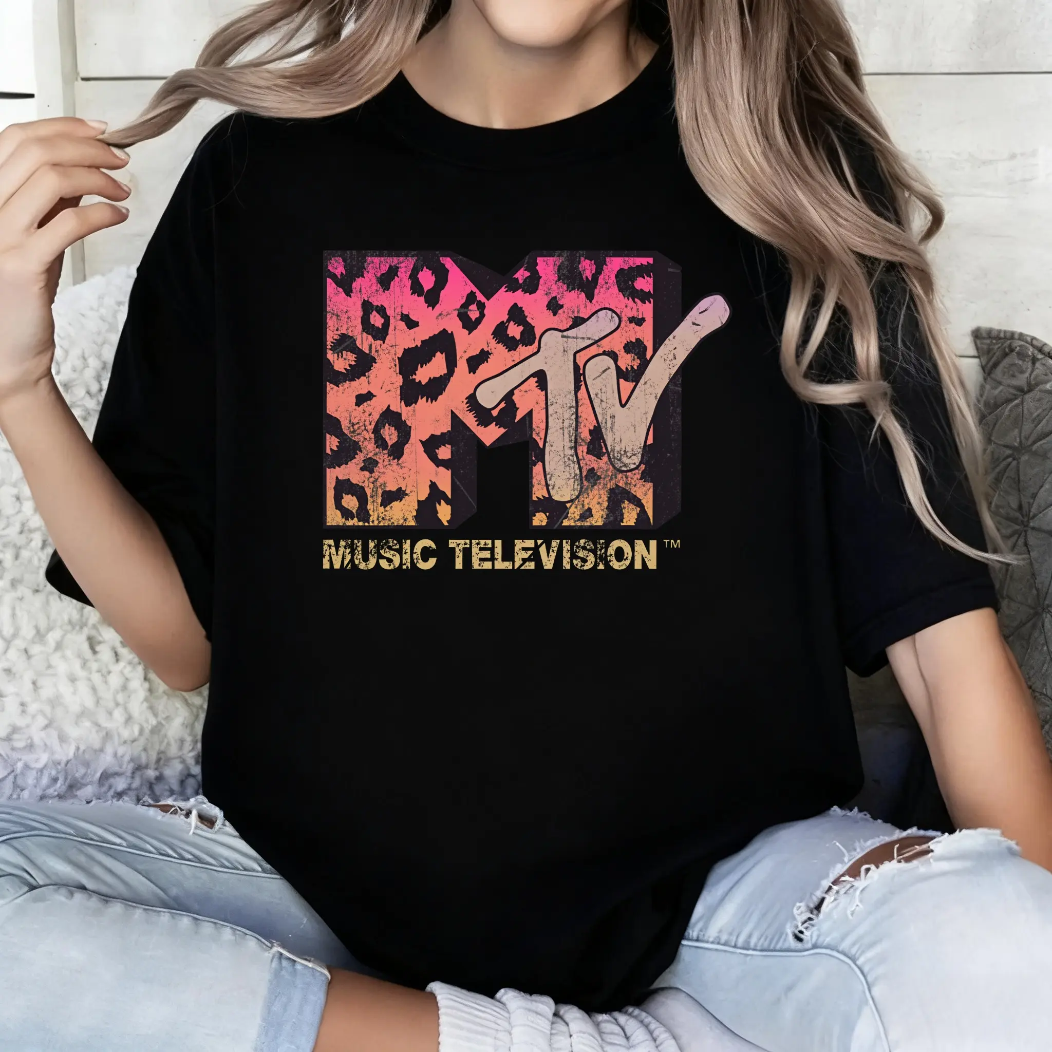 100 Percent Cotton Casual Fashion T-Shirt MTV Leopard Print Gradient Logo T-shirt, Music Television MTV Logo Tee, Retro 80s 90s Style MTV Matching Tee, Family Matching Tee