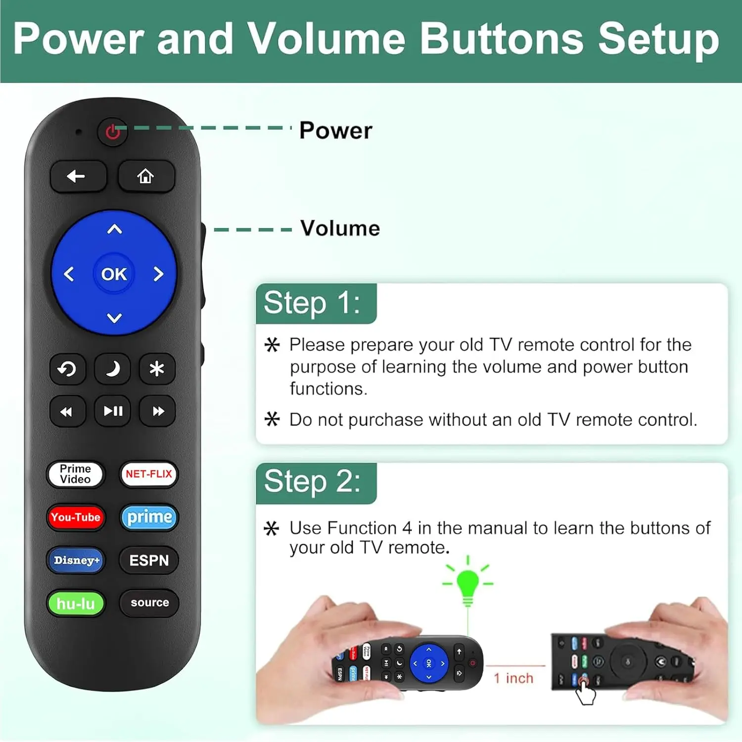 ---[Power and Volume Buttons Require Learning]Please prepare your old TV remote control for the purpose of learning the volume and power button functions.Use Function 4 in the manual to learn the buttons of your old TV remote.(Without the old remote control, Can't to set up the use of the volume and power buttons.)