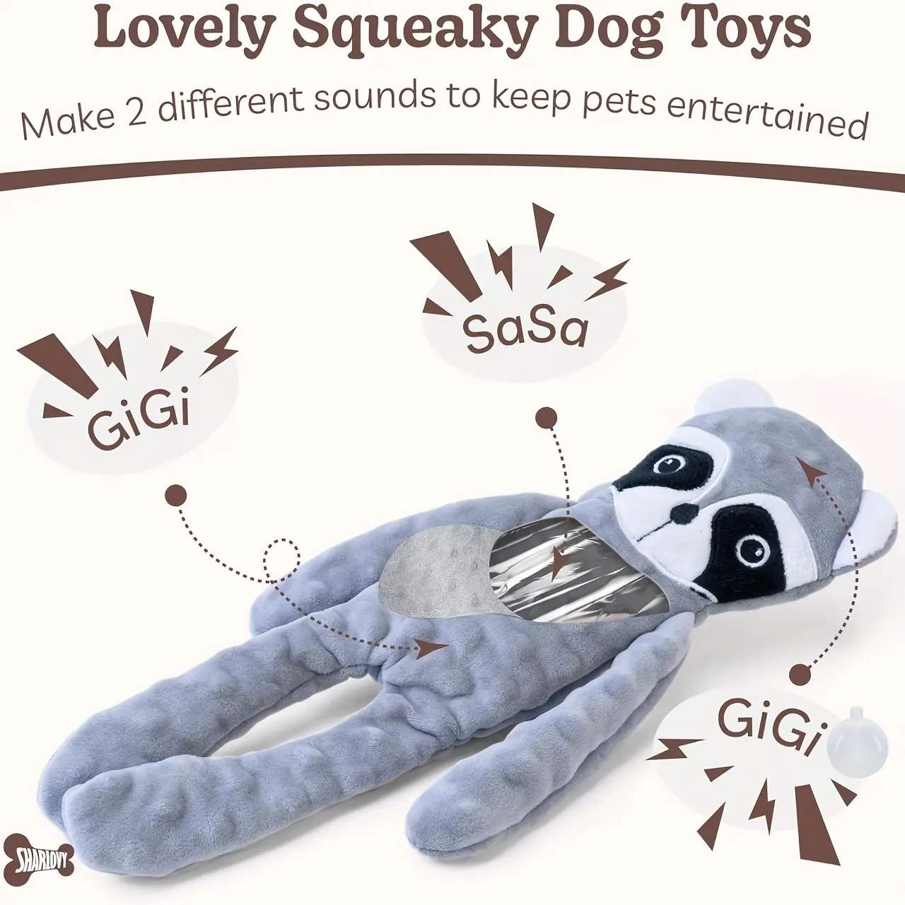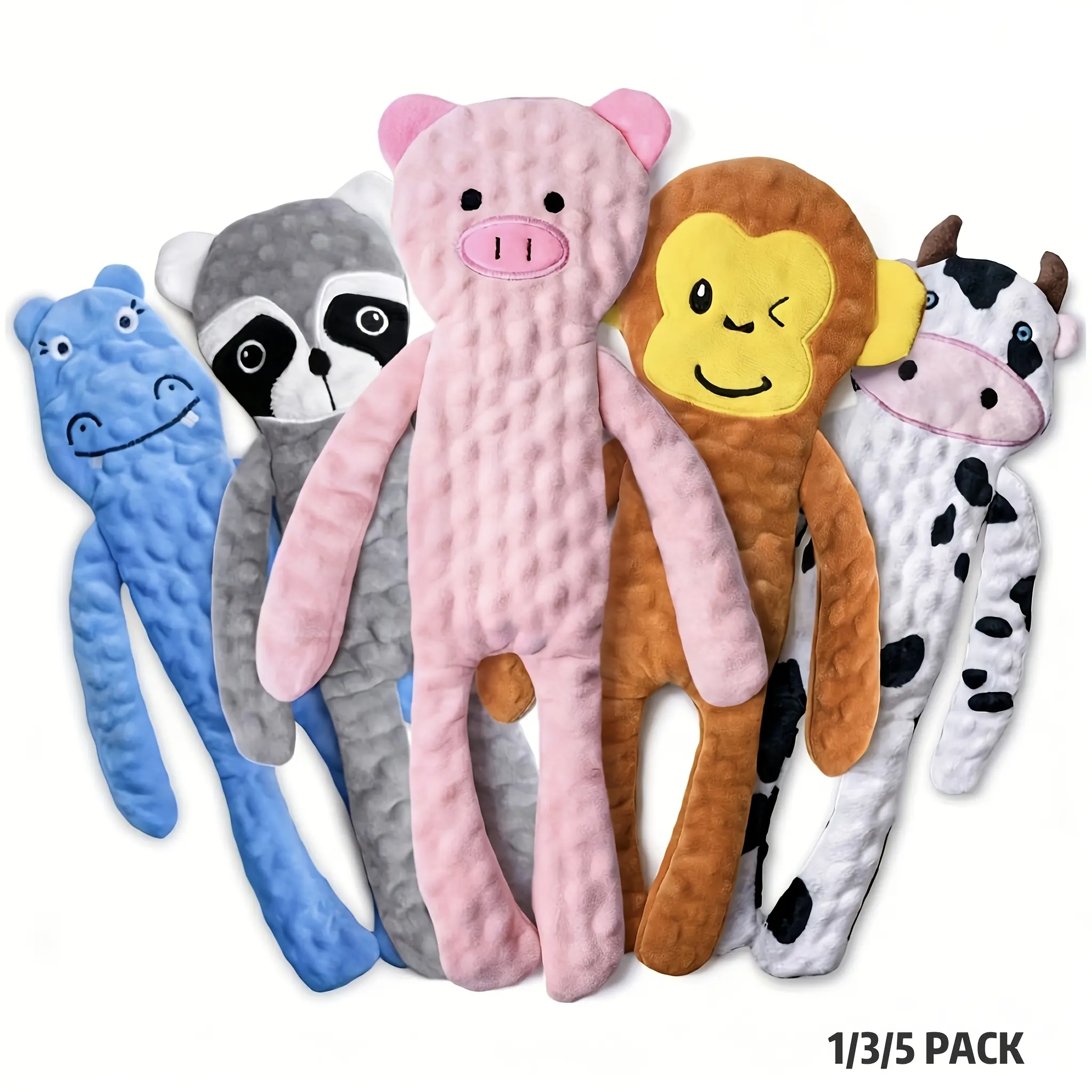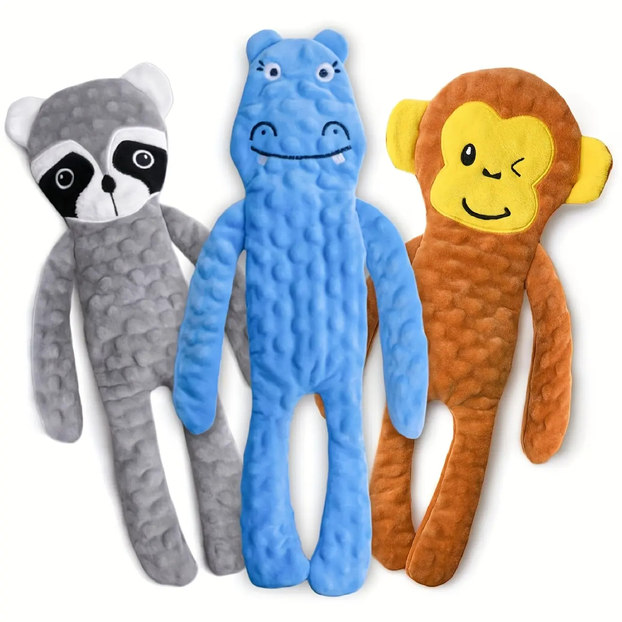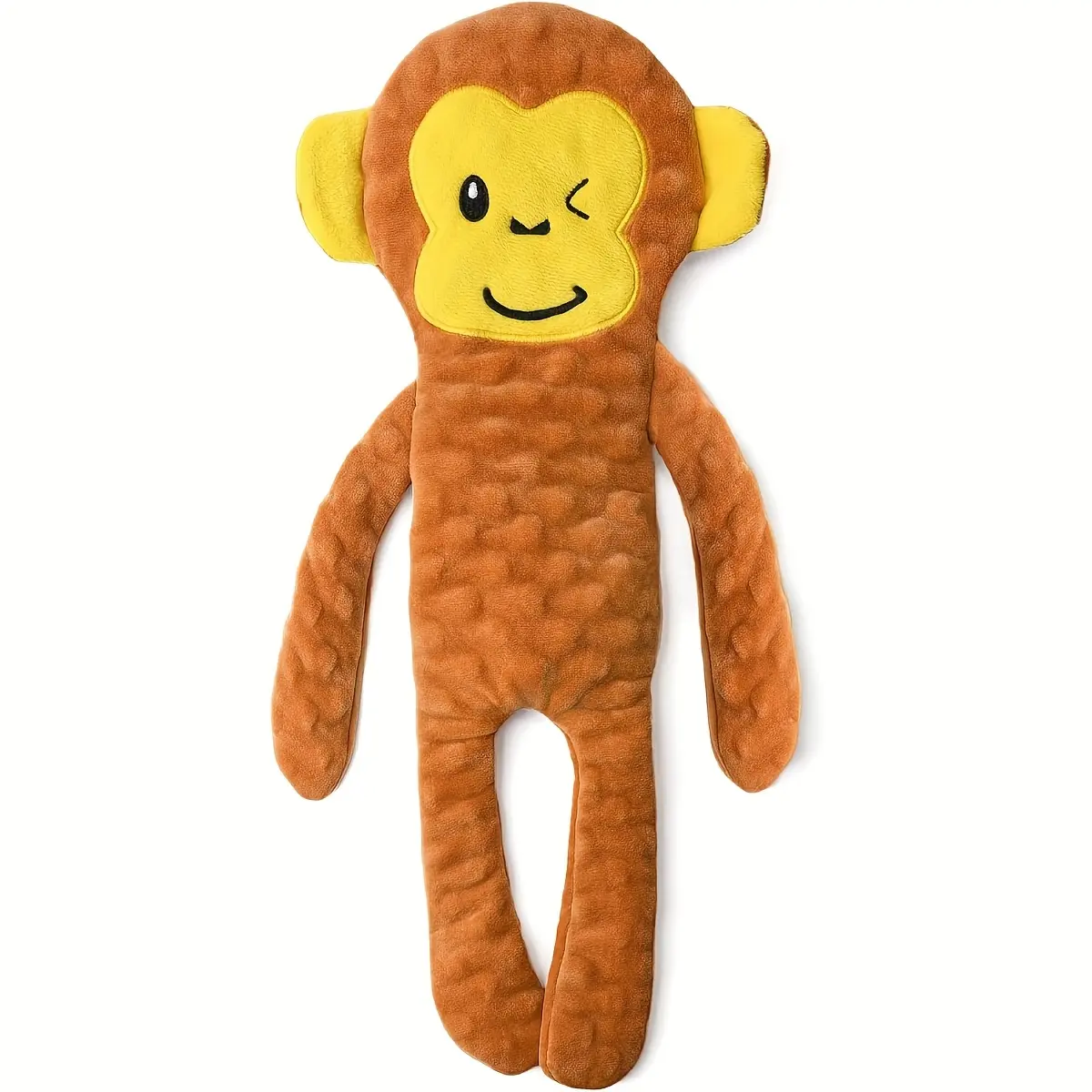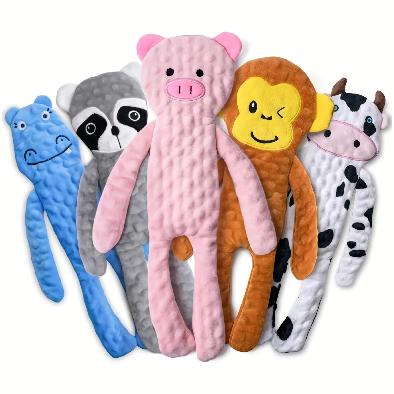 Interactive Dog Toys,Offer Companionship: Our dog toy with a plush texture and four soft, lengthy legs is the ultimate cuddle partner. It is highly suitable for pets that are fond of curling up and snuggling with stuffless dog toys. This dog toy for large dogs is made of upgraded soft bubble thicker fabric and stronger stitching, perfect as a toss, chew, fetch, pull and tug of war dog toy. Great puppy teething toys has comfortable touch for dogs without hurting gum and mouthSqueaky Dog Toys, Attract Attention: There are 2 different sounds inside the dog enrichment toys, squeakers and crinkle paper, drawing puppies' curiosity. Make noise help dogs keep active thinking and avoid boredom. Crinkle dog toy can attract the attention of dogs, make them concentrate on playing and reduce damaging furniture behaviorNo Stuffing Dog Toys, Safe to Play: Unstuffed dog toys means no mess and no choking risks. Embroidered eyes effectively keep pet always in a safe environment when chewing or playing. Soft puppy teething toys can provide gum massage and oral discomfort. Machine washable and Light Beige-friendly material allows dogs to bite freely without causing any damage to their teethCute Shapes, Keep Them Busy: The various animal shapes are designed to meet a dog's natural instinct to chase prey, including monkey, cow, hippo, pig and raccoon. Each model comes in 2 sizes for all breeds. These interactive dog toys are perfect for tugging, biting and throwing, and provide an opportunity to enhance intimacy with your dogsMore Love for Dog: This puppy toys is an infallible gift choice, on Birthday, Christmas, Halloween, Children's Day, Valentine's Day or other Holidays. It will become a loyal companion as pets grow up and help them pass the lonely time, also offering companionship and energy consumption. If there are any problems with the product quality, please don't hesitate to contact us