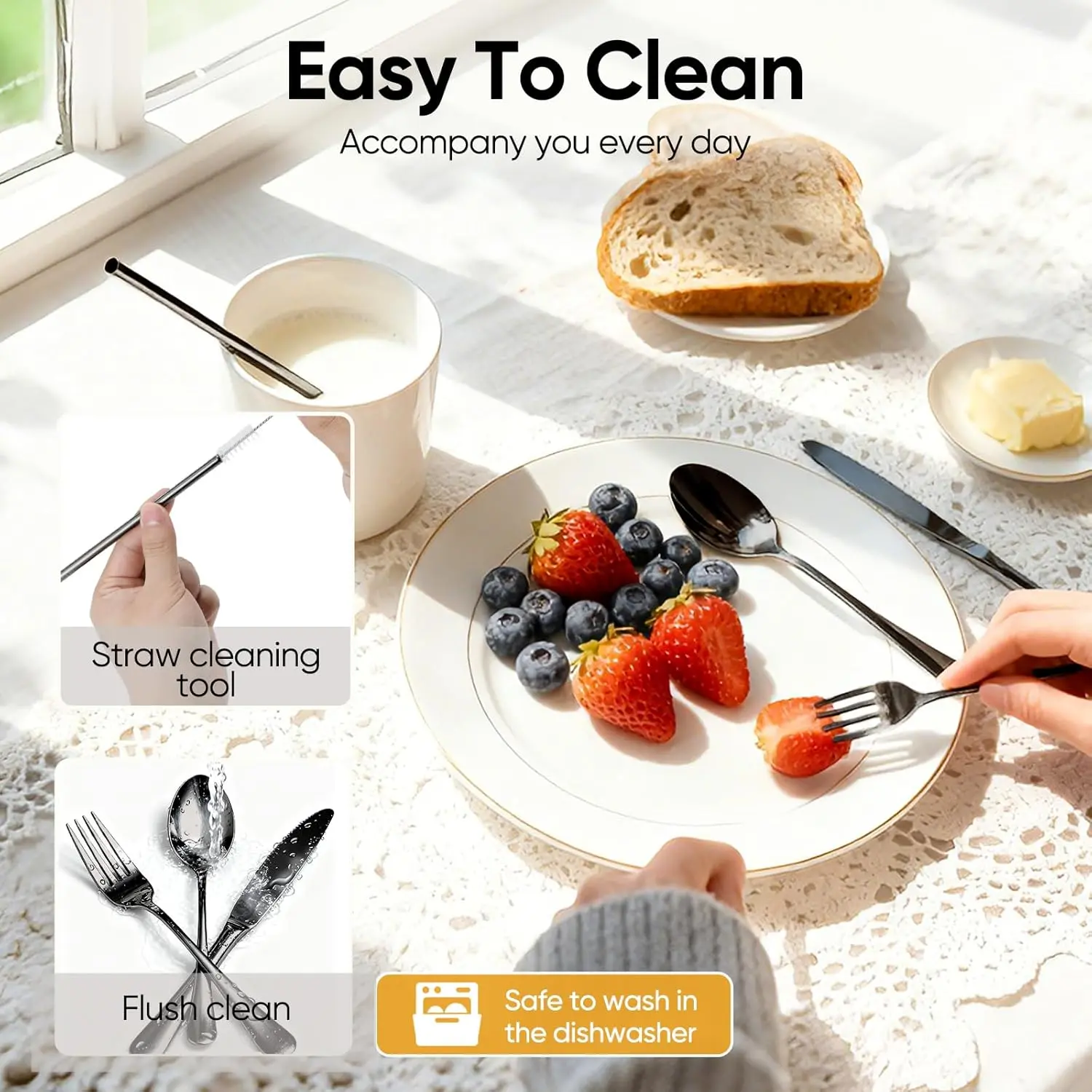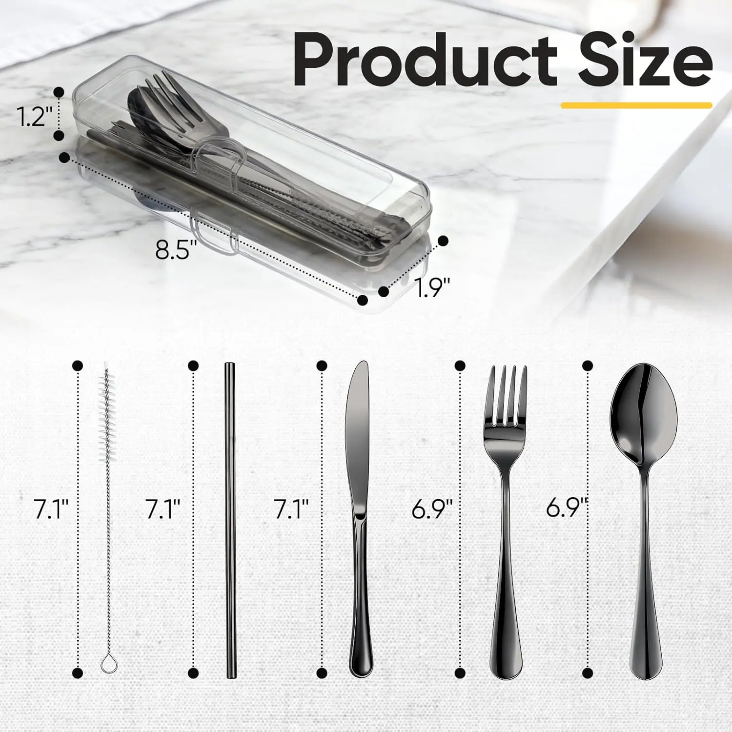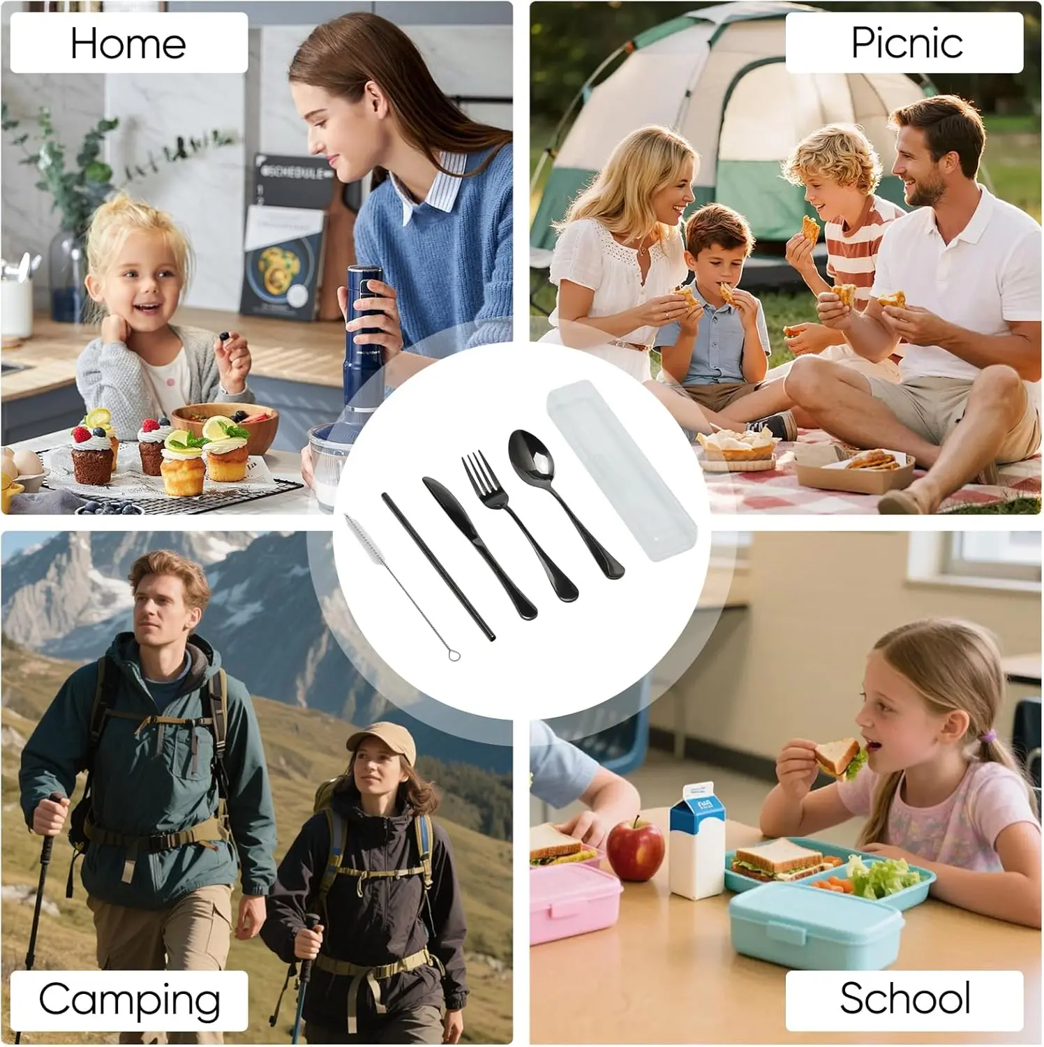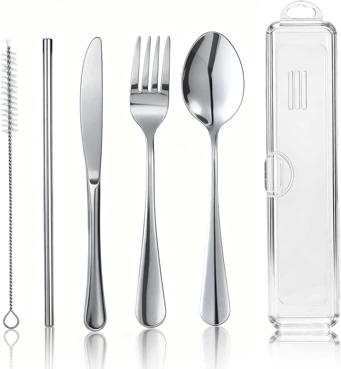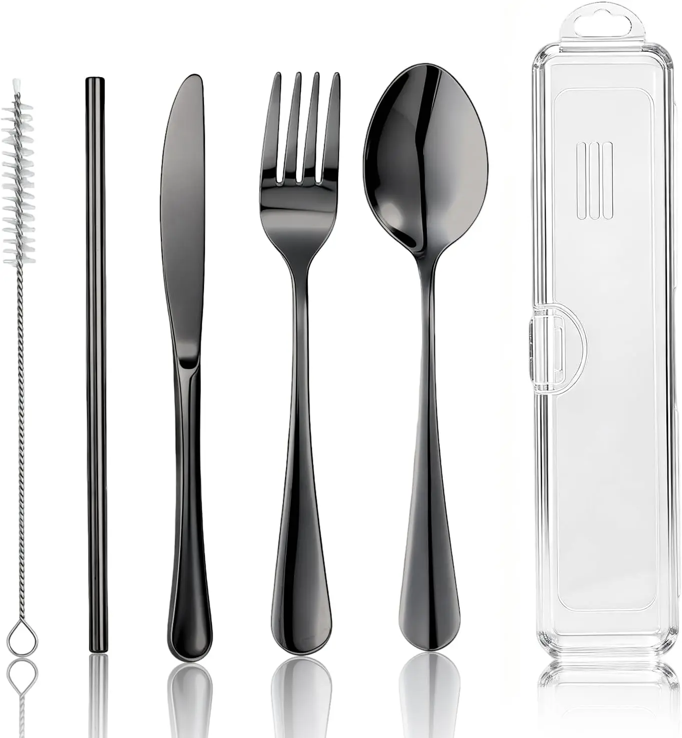 Complete 6-Piece Set – Includes spoon, fork, knife, reusable straw, cleaning brush, and a durable carrying case. Perfect replacement for single-use plastics.