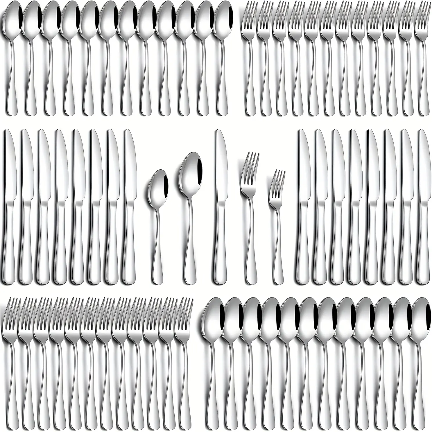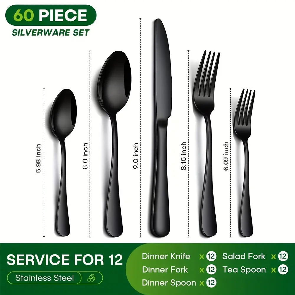 60pcs Silvery/Black Stainless Steel Silverware Suitable For 12 People To Use, Steak Knife, Salad Fork, Dessert Spoons, Cutlery Set With Gift Box, Kitchen Accessories, Home Outdoor, Wedding Camping Stuff, Christmas Party Gift, Dishwasher Safe