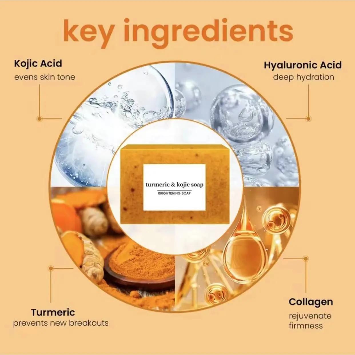 our turmeric and kojic acid bar may cleanses your skin mayimprove dark spots, may reduce hyperpigmentation, mayreduce face and body acne. This bar may be used all ovethe body wherever Safe and gentle enough for everydayuse.