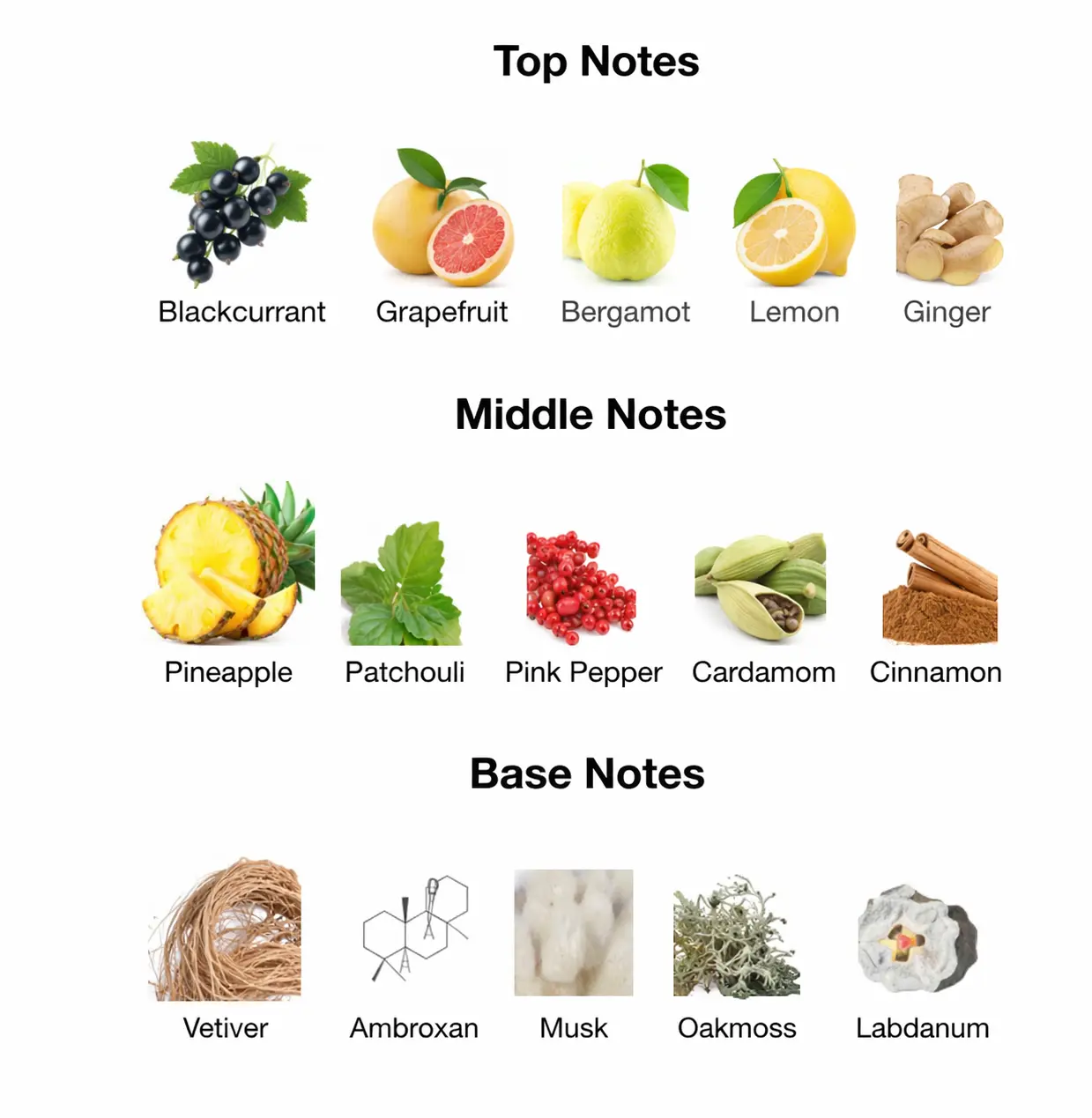 Top : Bergamot, Lemon, Grapefruit, Blackcurrant, Ginger