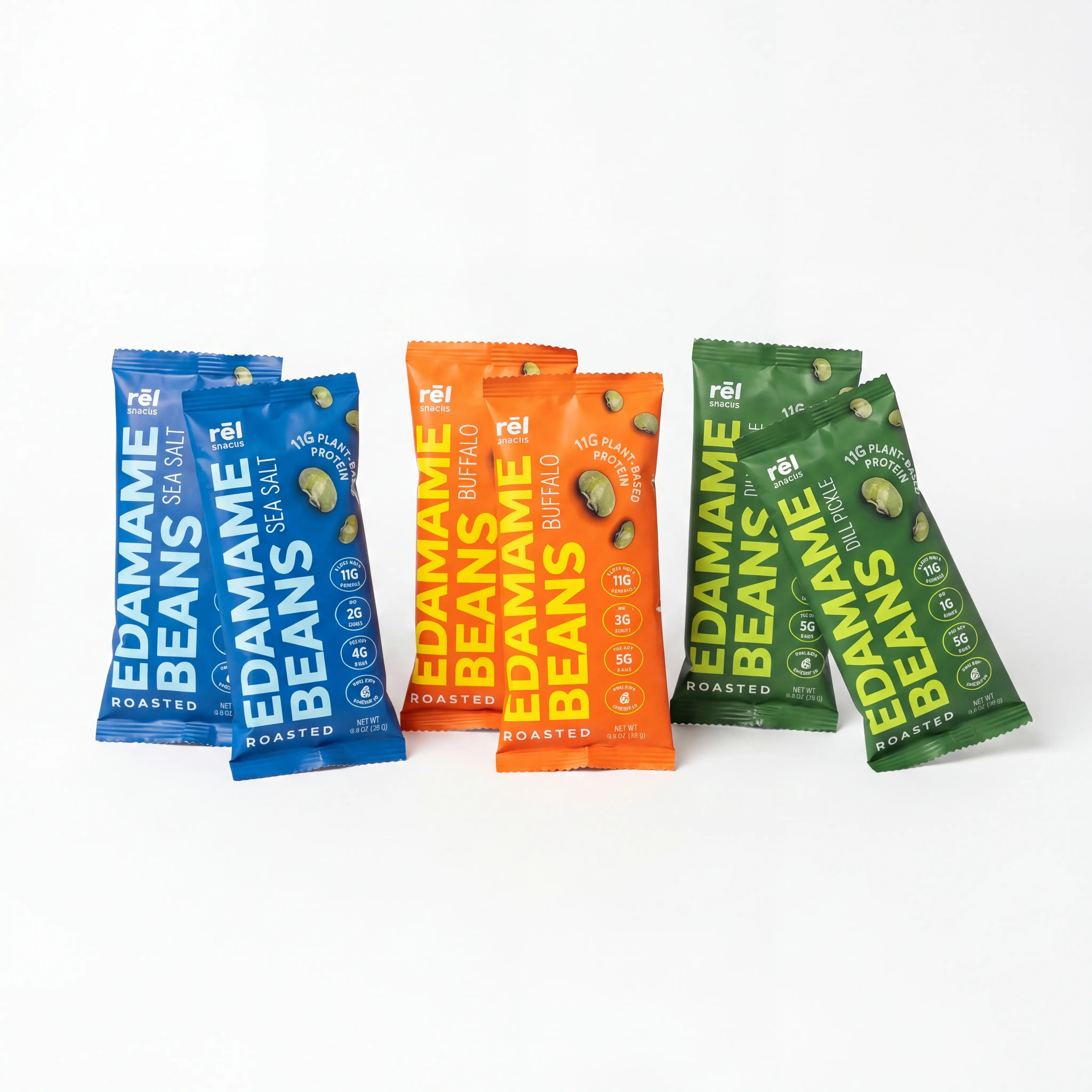 Six-pack sampler featuring all three Rēl Snacks flavors. Two Sea Salt, two Buffalo, two Dill Pickle. Roasted edamame, avocado oil, clean ingredients. Created exclusively for creators to try all three flavors before promoting.