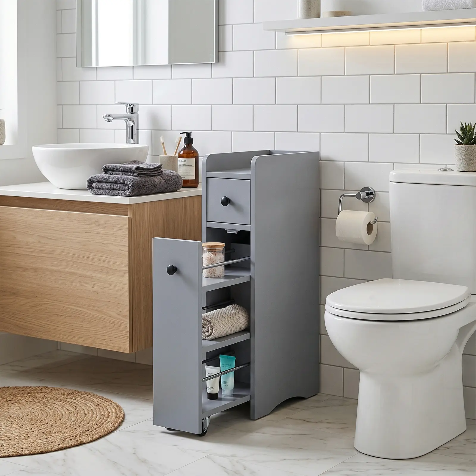 Transform wasted narrow gaps into functional storage with this ultra-slim 18cm bathroom cabinet designed for apartments and compact layouts. Measuring just 7 inches wide but offering 70cm of vertical storage, this rolling unit features two smooth drawers plus a movable pull-out rack on wheelsβperfect for squeezing beside toilets, sinks, or washing machines. The moisture-resistant gray melamine finish withstands humid environments while the mobile design brings hard-to-reach items right to you.
