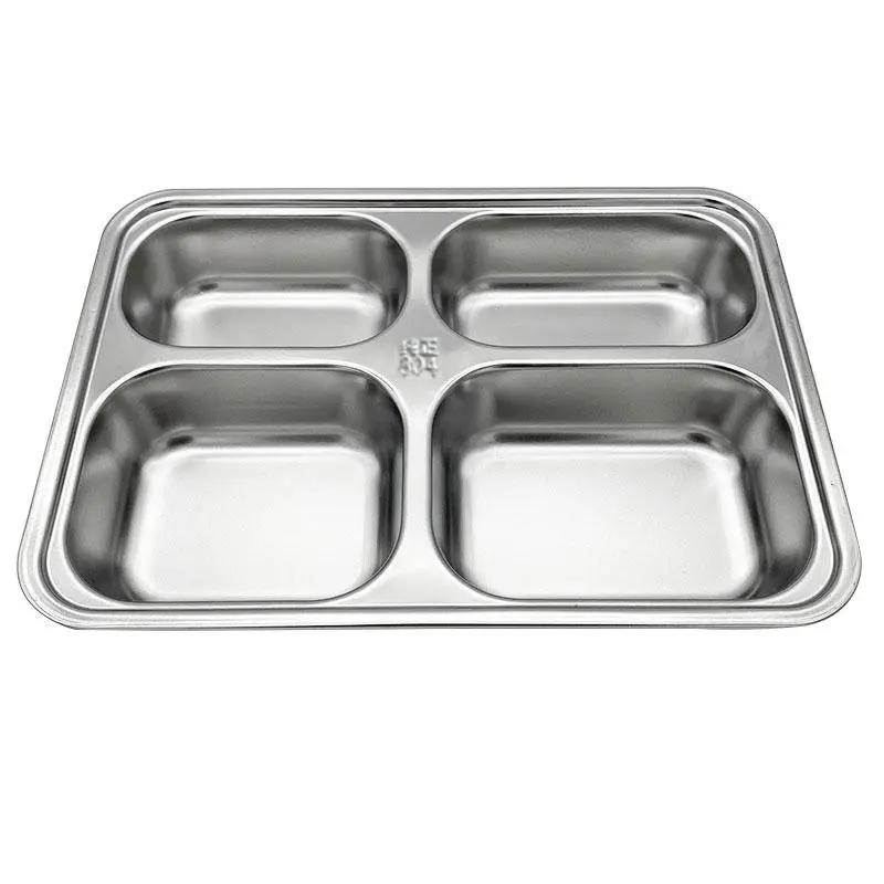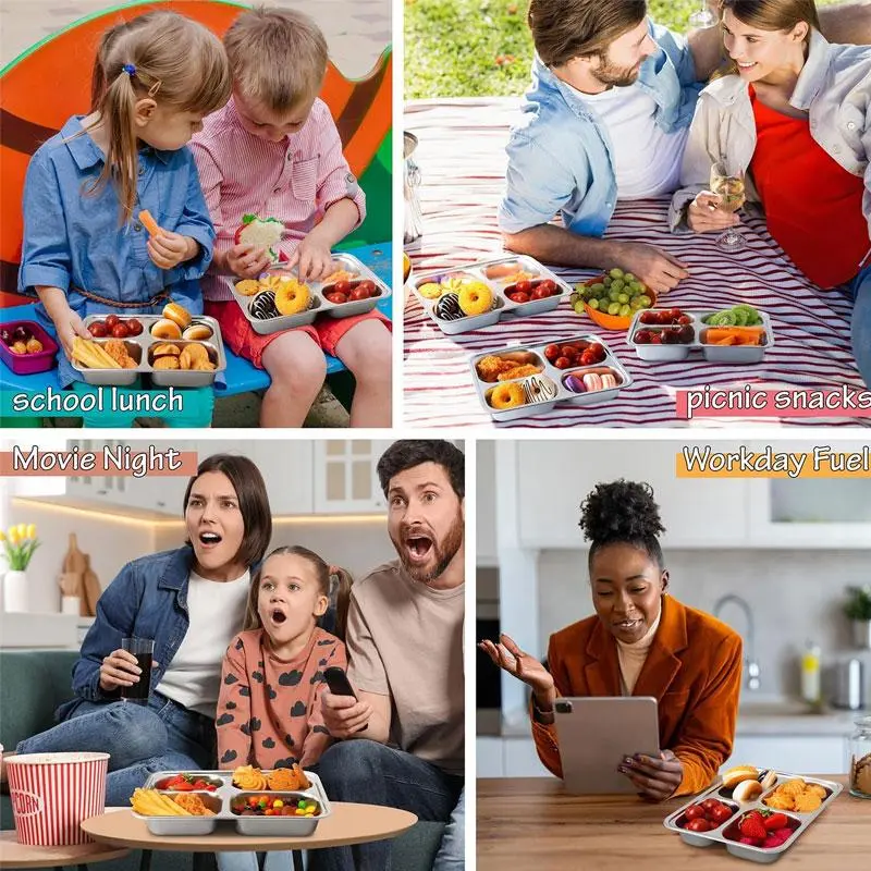 4-Piece Set Stainless Steel Rectangular Divided Plates, Five-Section Meal Plate, Dishwasher Safe, BPA-Free, Leakproof Design, Salad Serving Plates