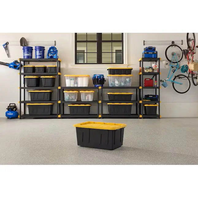 Project Source Commander 27G heavy duty stackable storage tote is designed to handle your tough storage and organization needs whether it's on the jobsite or around the house. A thick wall design paired with a heavy duty plastic material gives you peace of mind and keeps your valuables safe. The recessed lid allows you to securely stack multiple units without fear of tipping while optimizing vertical storage space. The easy open and close dual-snap lid keeps your items securely inside the Project Source Commander storage tote without the lid coming off. For additional security, holes around the outer rim enable the use of zip-ties and padlocks to keep your items safe on the jobsite, or from children and pets. Safely transport your totes by utilizing the tie down grooves to keep the tote from moving on the road. The popular black and yellow colors of the Project Source Commander 27G Storage Tote stands out nicely on a construction site or when looking for it in storage. This Project Source Commander 27G heavy duty stackable storage tote is ideal for bulky items such as seasonal decorations, hardware, camping gear, and more.