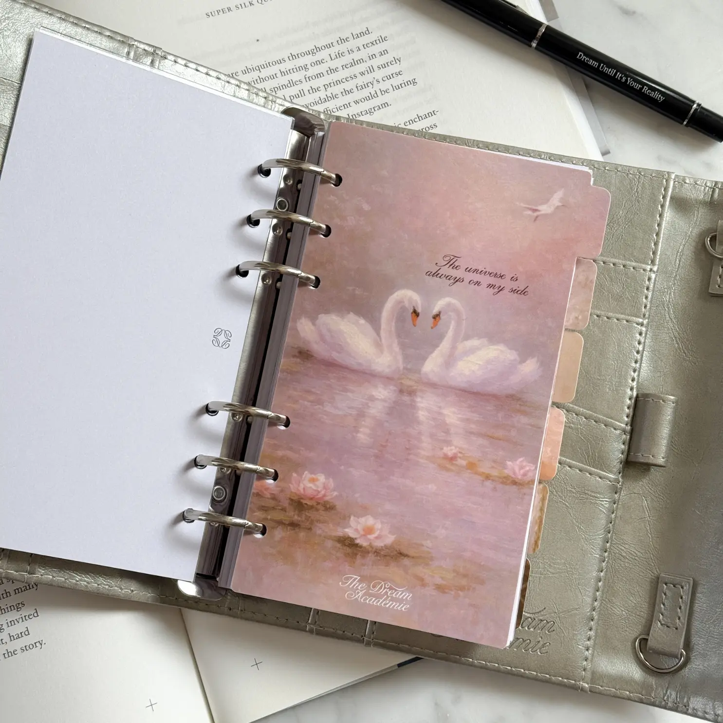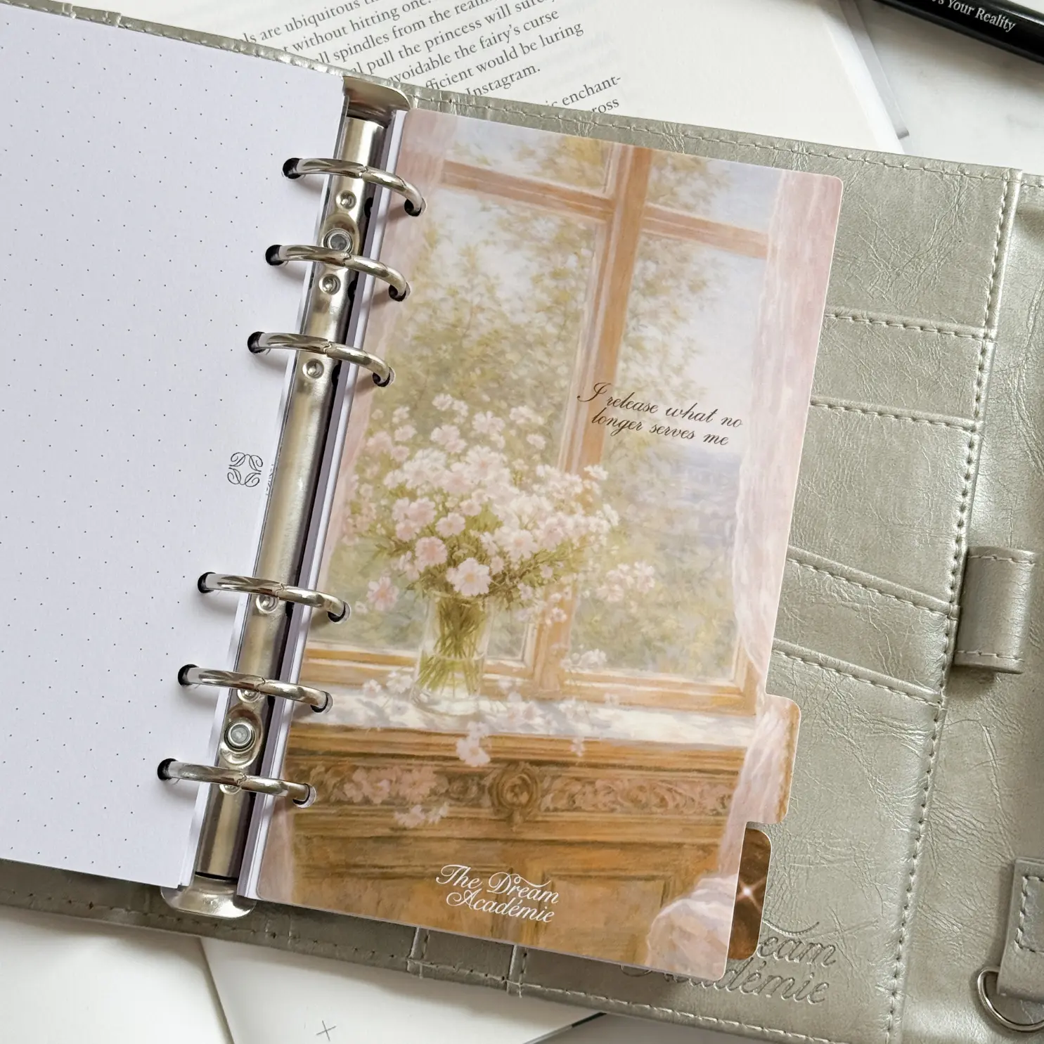 The Soft Life Planner Dividers Set is a set of 6 illustrated A5 or A6 planner dividers featuring romantic, painterly artwork and affirmations. Swans, candlelit tablescapes, pearls, blooming windows, stacked gift boxes, and garden florals — each divider feels like fine art inside your planner.