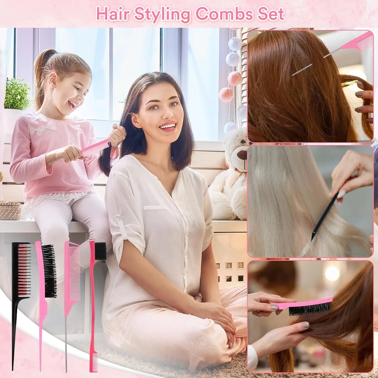 ·【Value Pack Hair Styling Set】Our hair styling accessories kit comes with 2400pcs hair rubber bands in 24 different vibrant colors, 2pcs topsy tail hair tools, 2pcs hair braiding tools, 2pcs nylon teasing hair brushes, 2 pcs rat tail combs, 2pcs hair clips. A total of 1932pcs including all the necessary hair styling accessories for toddlers, baby girls, kids, women to create various simple and elegant hairstyles