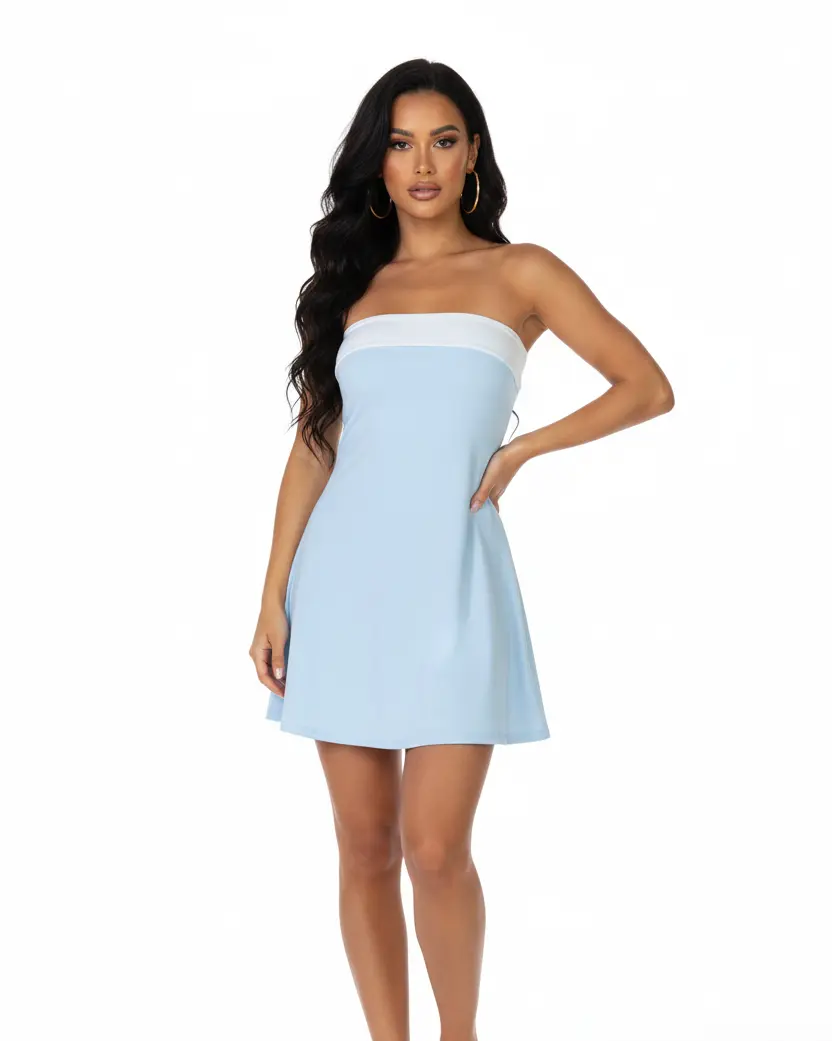 The Color Block Strapless Bodycon Mini Dress is a modern wardrobe essential that effortlessly blends structure with style. A bold color-block patchwork design pairs a sleek strapless bandeau top with a flared A-line mini skirt for a silhouette that's equal parts chic and playful. The high-waist cut elongates the figure while the bodycon fit flatters every curve. Crafted in a smooth triacetate fiber that drapes beautifully and feels luxurious against the skin.