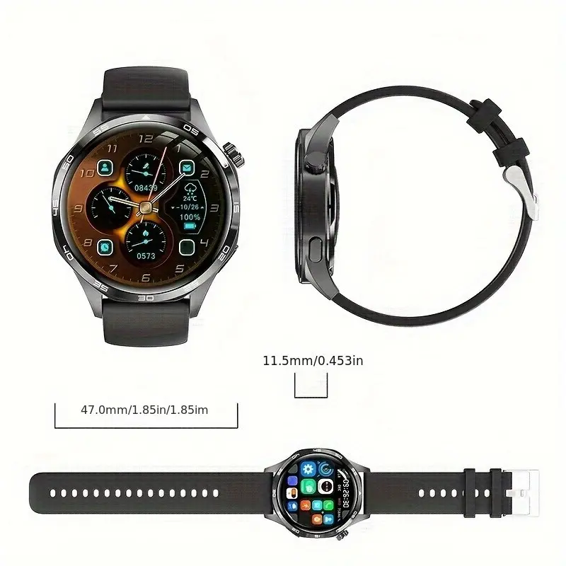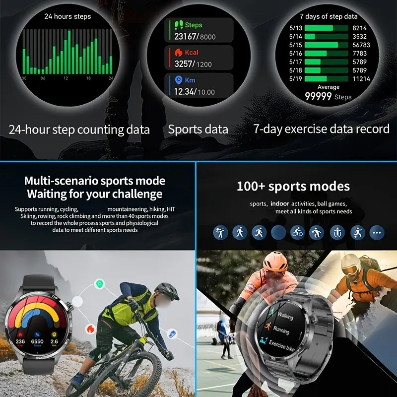 Universal smart sports watch, 1.83 inches HD touch screen, wireless calling, compatible with Android/iPhone, over 100 sports modes, pedometer, blood pressure and heart rate sports tracker, stainless steel and silicone dual strap, waterproof.