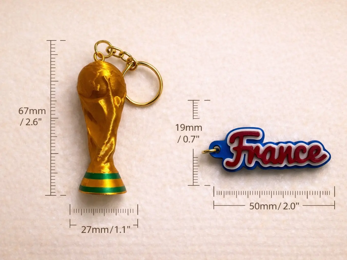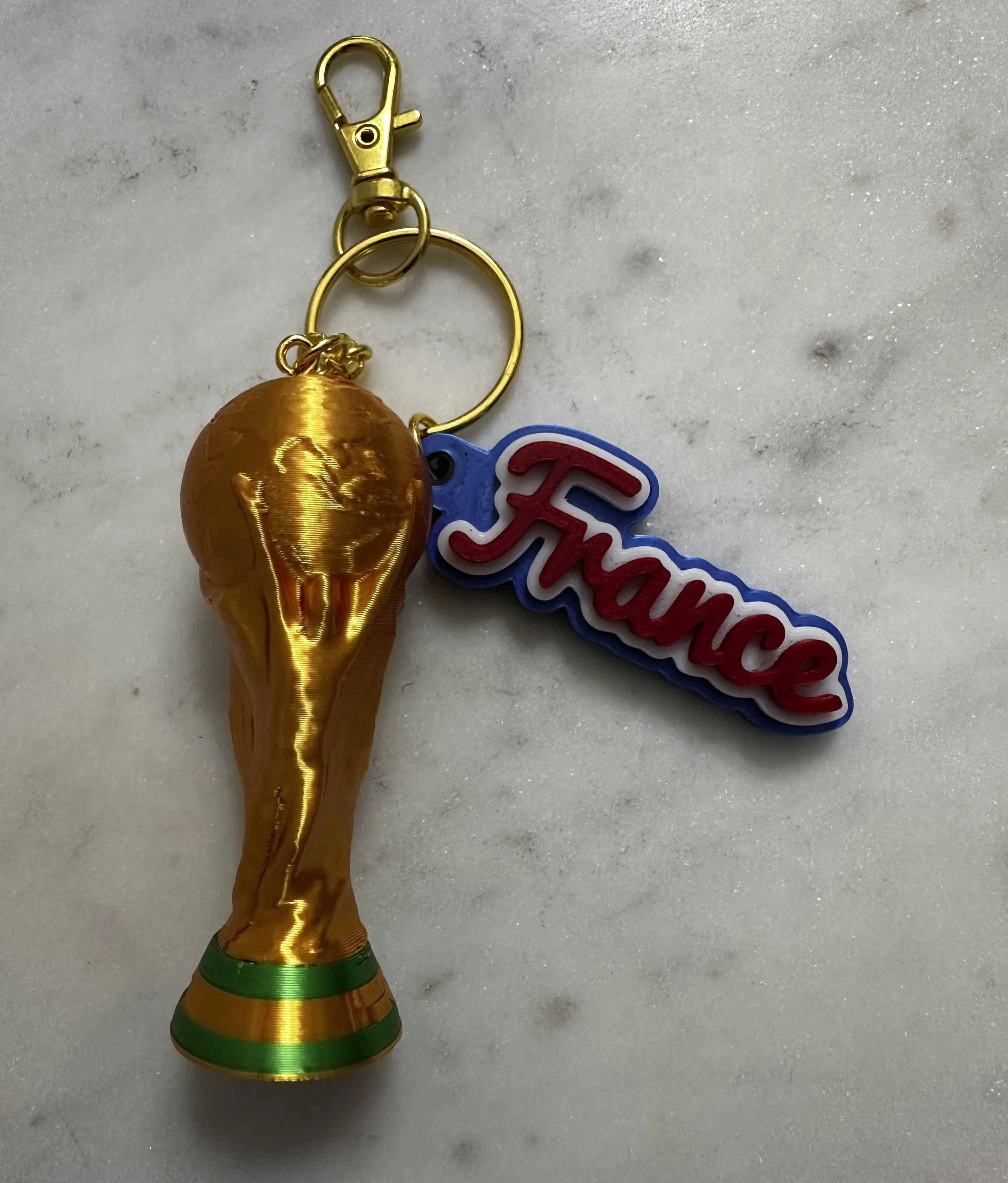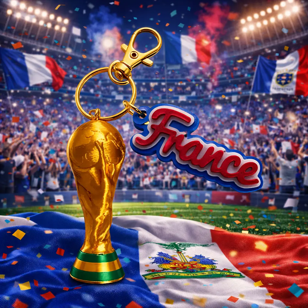 Show your support for France with this stylish 2026 World Cup trophy keychain collectible. Featuring a detailed trophy design alongside the France name in iconic national colors, this piece is perfect for fans who want to represent their team with pride.