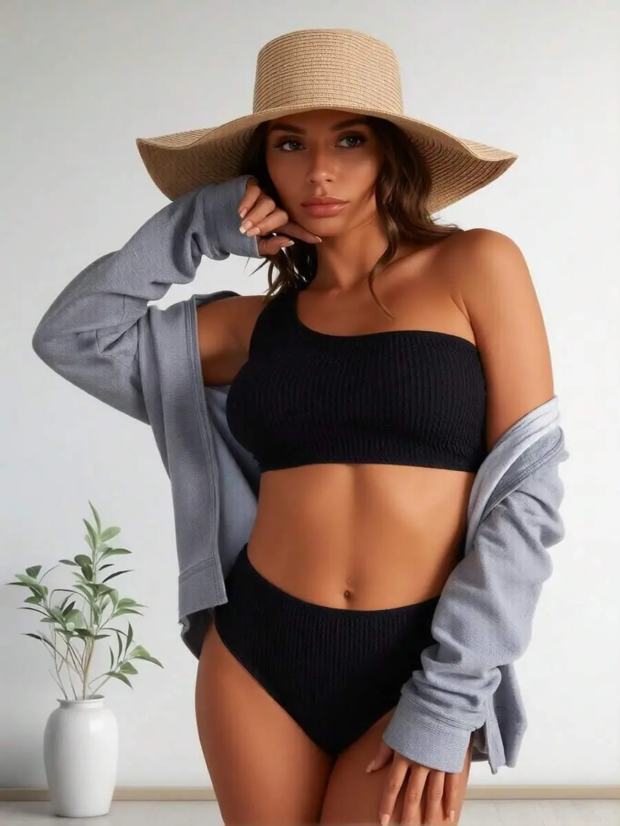 Briza|Women's Black One-Shoulder High Waisted Bikini Set - Textured Ribbed 2 Piece Swimsuit, Tummy Control Cheeky Bathing Suits For Summer Beach & Pool