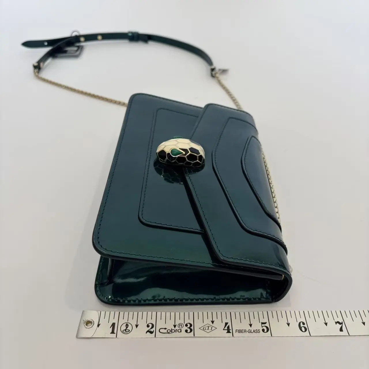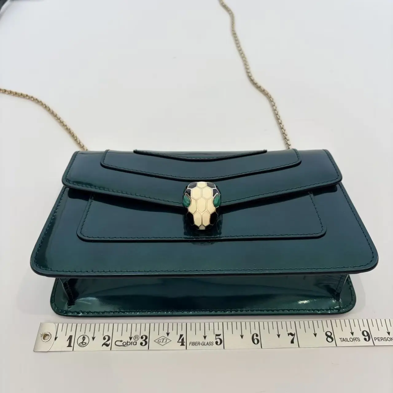 This pre-owned Bvlgari Serpenti Forever Flap Bag is crafted from glossy patent leather in a rich green tone, offering a bold and modern look. The design is highlighted by the iconic Serpenti snake head closure, a signature detail that reflects Bvlgari’s heritage and craftsmanship.