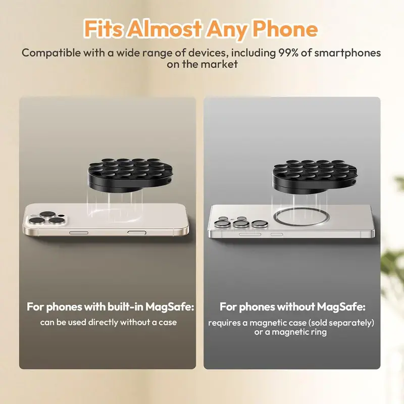 Powerful magnets grab iron surfaces in seconds. No adhesives or tricky installs—just set and stick. Ideal for hands-free gym videos or garage use. Works with iPhone 12-17 (MagSafe), MagSafe cases, or any phone. It includes a metal ring for non-MagSafe cases.