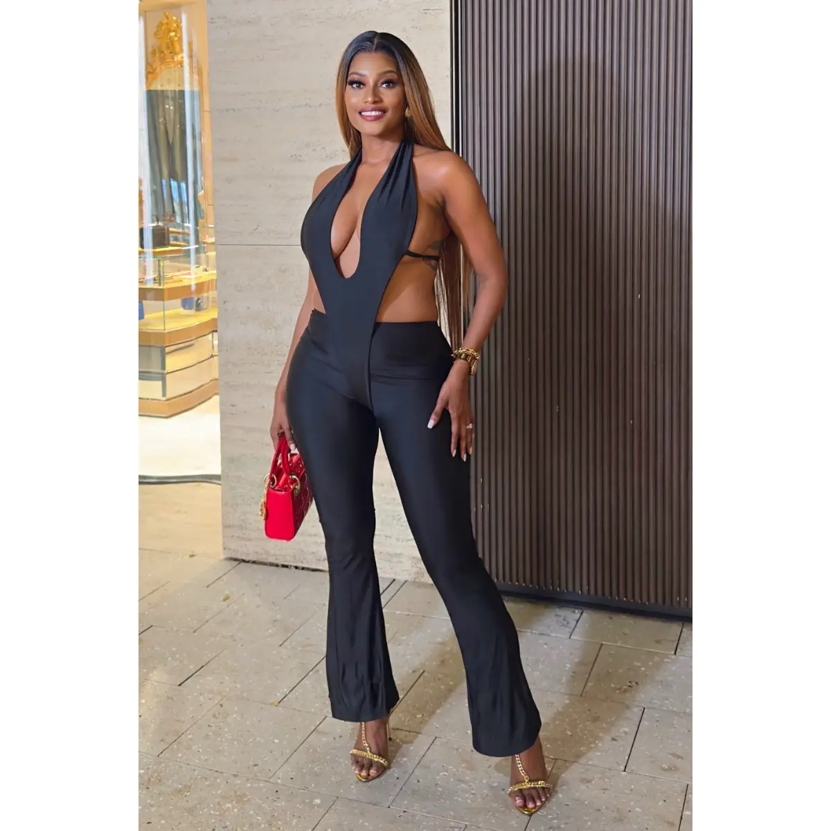 Meet the jumpsuit that does all the talking. Power Play is sleek, sultry, and sculpted for impact. Its deep-V halter cut draws eyes in all the right ways while the flared leg elongates your frame, pure soft-life confidence.