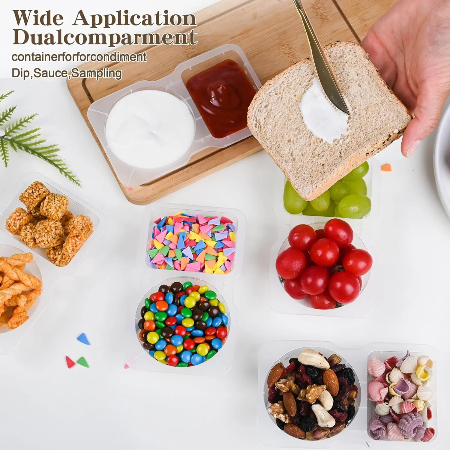 The reusable snack containers with lids of 2 snack pack containers,It can be used both for condiments as well as snacks.This design allows for convenient storage and carrying of different foods,can completely avoid the mixing of food flavors and keep food fresh