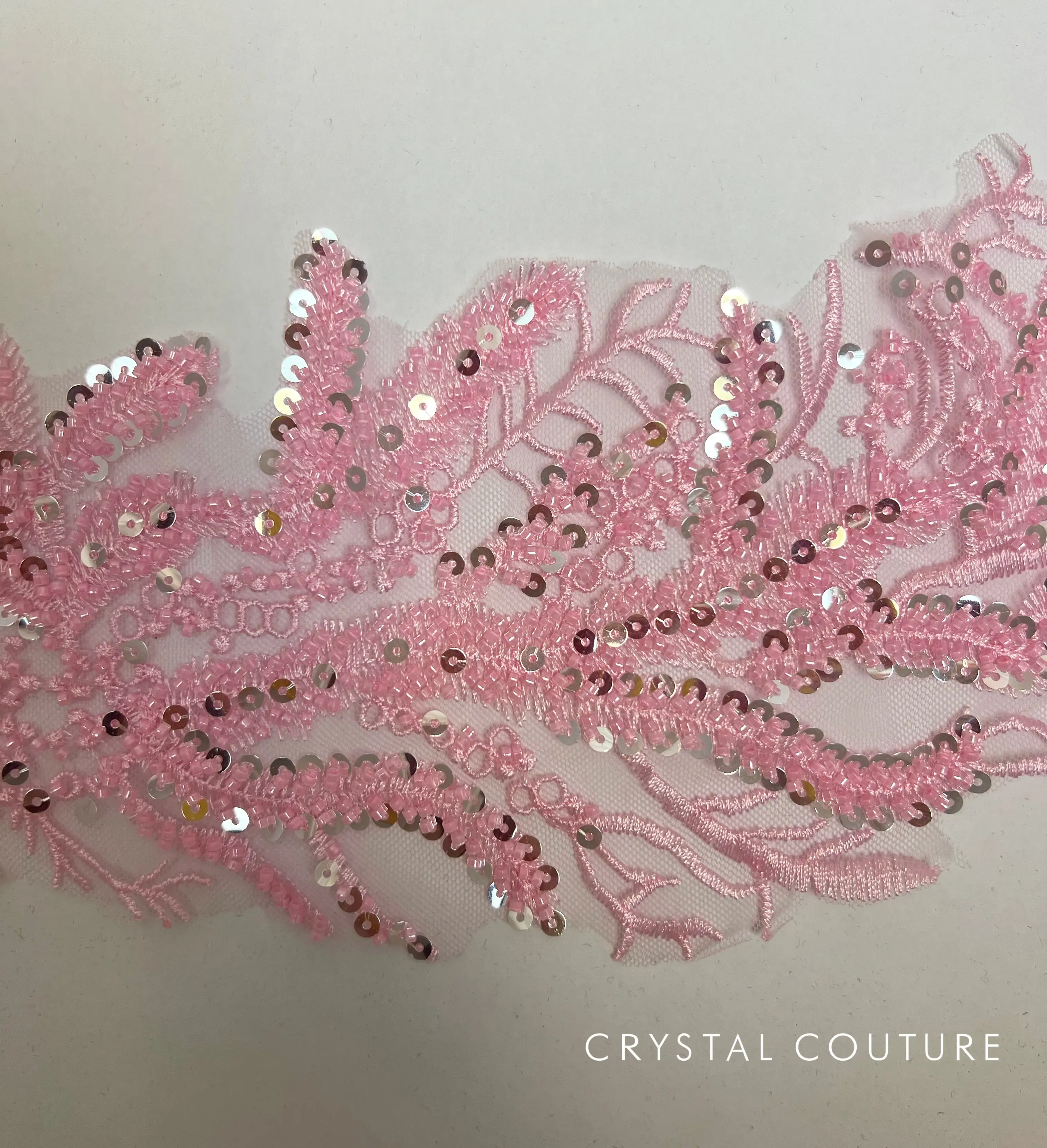Bright pink embroidered applique with silver sequins and matching pink sea beads.