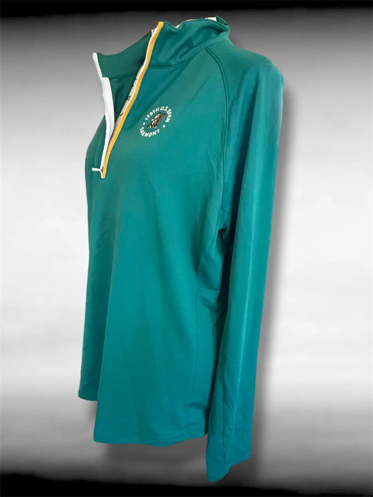 Elevate your golf game with this Women's Walter Hagen Performance 11 1/4 Zip Pullover—a versatile long sleeve shirt designed for active play and everyday wear. Crafted in rich Forest Green with an embroidered patch commemorating the 125th U.S. Open at Oakmont, this shirt combines style with serious performance. Advanced moisture-wicking technology keeps you dry and comfortable, while 4-way stretch fabric moves with you effortlessly. Wrinkle-resistant construction means less fuss, more golf. Plus, UPF 50+ sun protection shields your skin on the course and beyond. Available in Large and XL.
