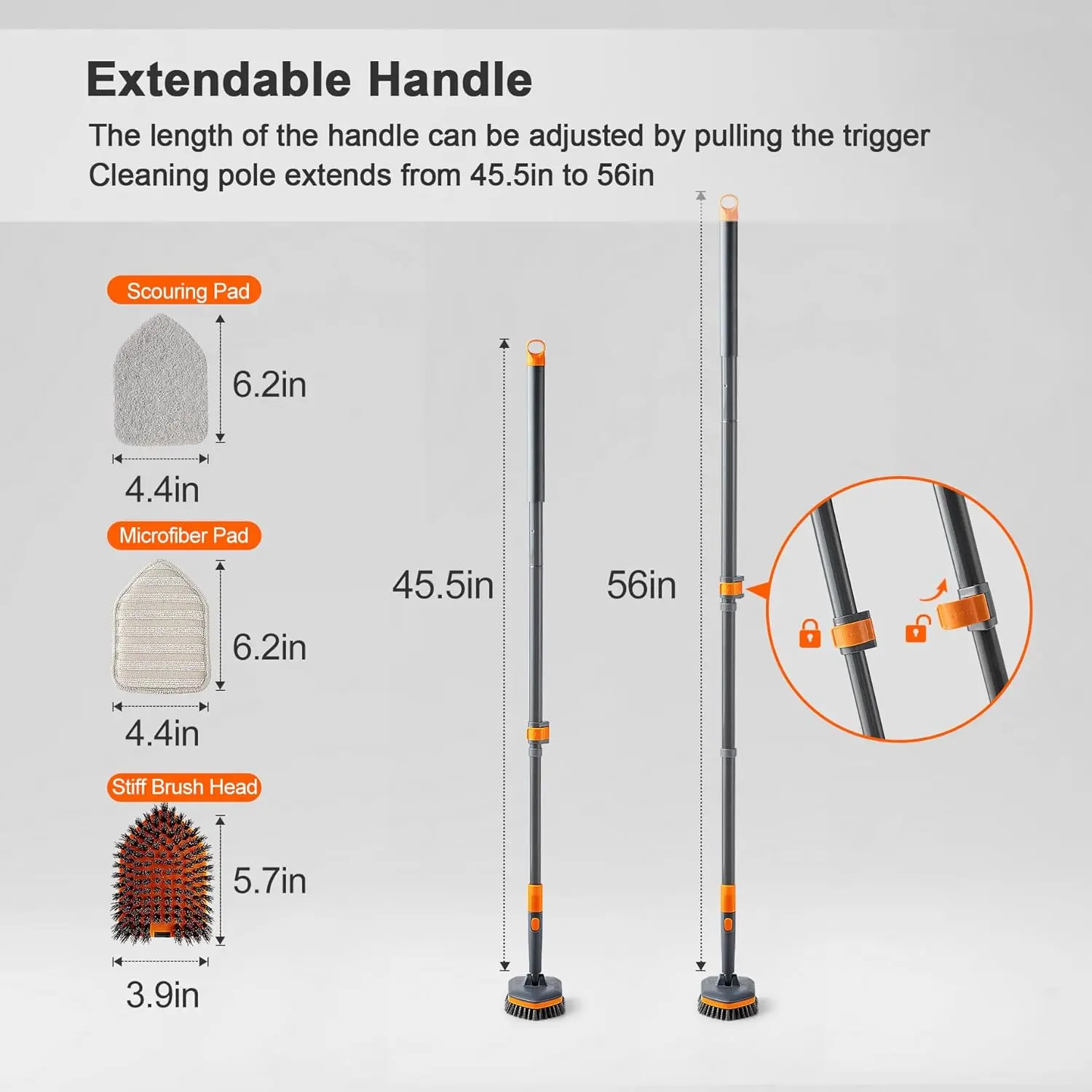 ·Product SpecificationsThe scrubber features an extendable handle ranging from approximately 45 to 56 inches. It includes three cleaning heads: a stiff bristle brush, scouring pads, and a microfiber pad. The handle is made of stainless steel for durability, while the heads are designed for safe use on multiple surfaces. Suitable for bathroom, kitchen, and general household cleaning.