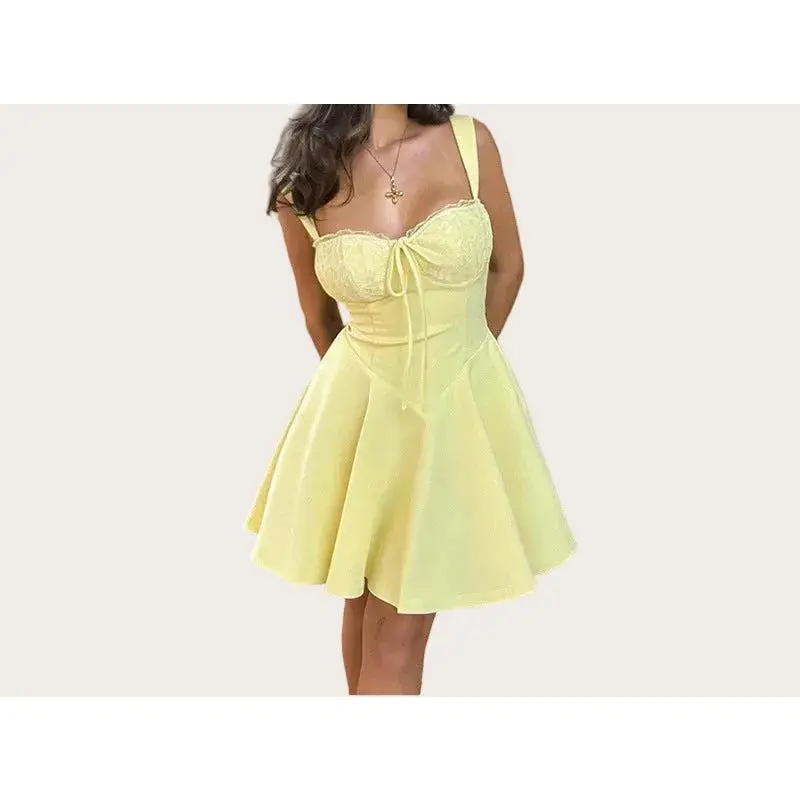 Details: – Vibrant yellow color – Puffy strap design – Flattering cinched waist – Sleeveless, off-shoulder-inspired look – Easy, one-piece style