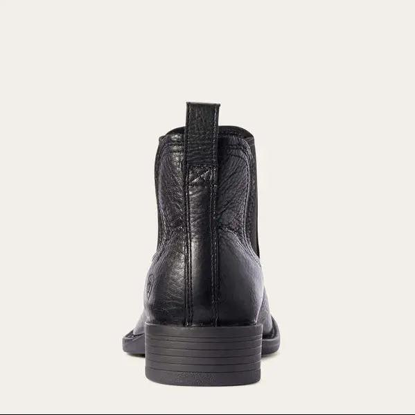 The Ariat Booker Ultra Black Ankle Boot delivers a sleek Western look with everyday comfort. Made with premium full-grain leather, this pull-on Chelsea-style ankle boot features elastic side panels, a wide square toe, and a clean all-black finish that pairs easily with jeans or dressier looks.